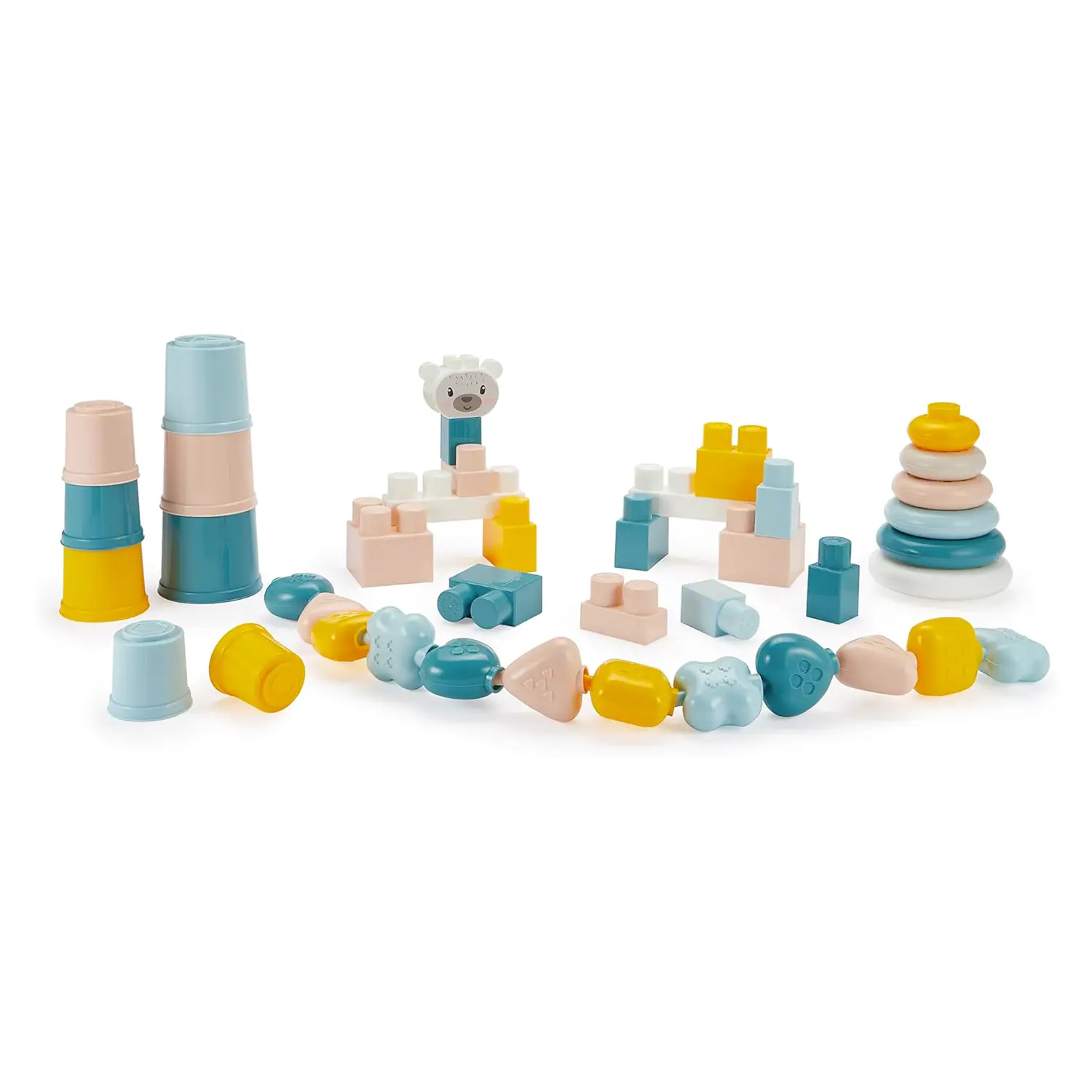 Una confezione completa e ricca di stimoli - All’interno troverai 1 piramide da impilare con 7 elementi, 12 perline da infilare, 8 barattoli impilabili ed estraibili e 14 mattoncini per costruire. Tutti i componenti sono pensati per accompagnare il bambino nella scoperta delle prime forme, colori e movimenti.