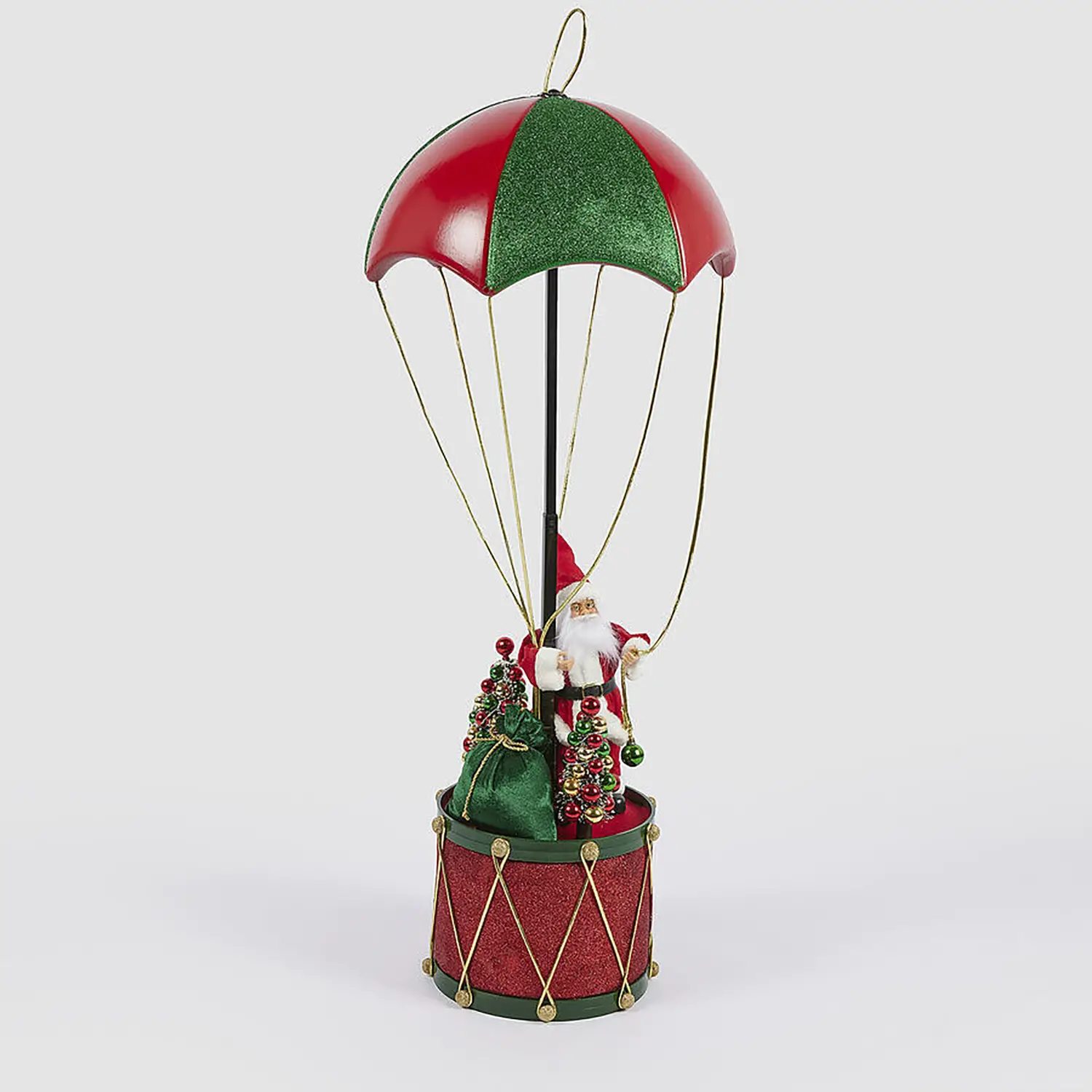 Design spettacolare – Babbo Natale scende con il paracadute sopra un tamburo decorato, con dettagli curati e brillanti che rendono la scena unica e scenografica.