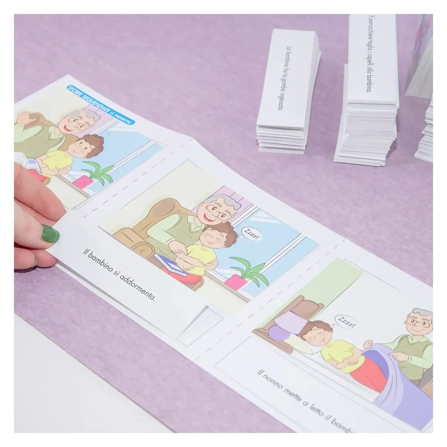 Sviluppo Linguaggio Attenzione e Temporalità Il set è progettato per potenziare abilità chiave come linguaggio, attenzione e comprensione temporale. Le sequenze logiche aiutano i bambini a organizzare pensieri e azioni, favorendo uno sviluppo cognitivo completo.