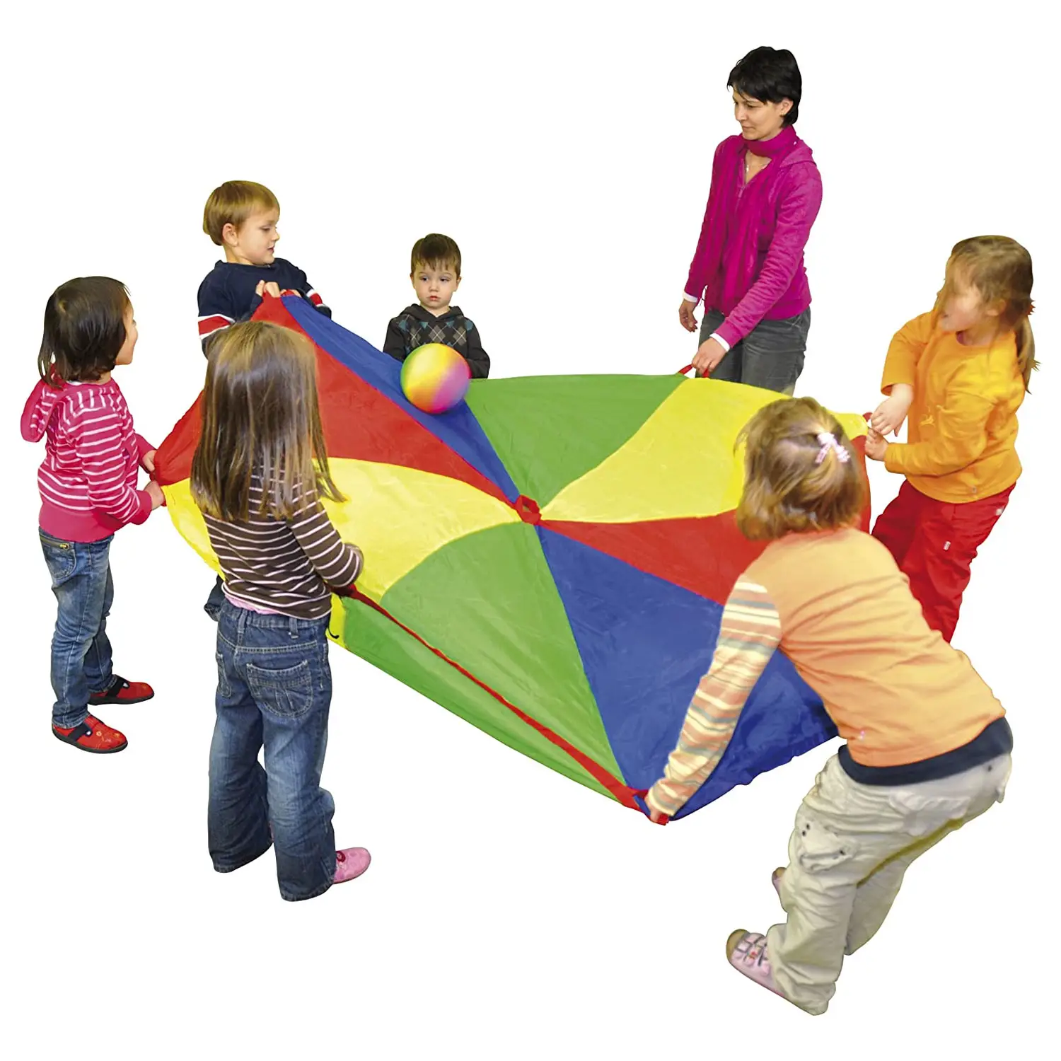 Paracadute in resistente nylon con 20 maniglie sul perimetro per una facile presa.