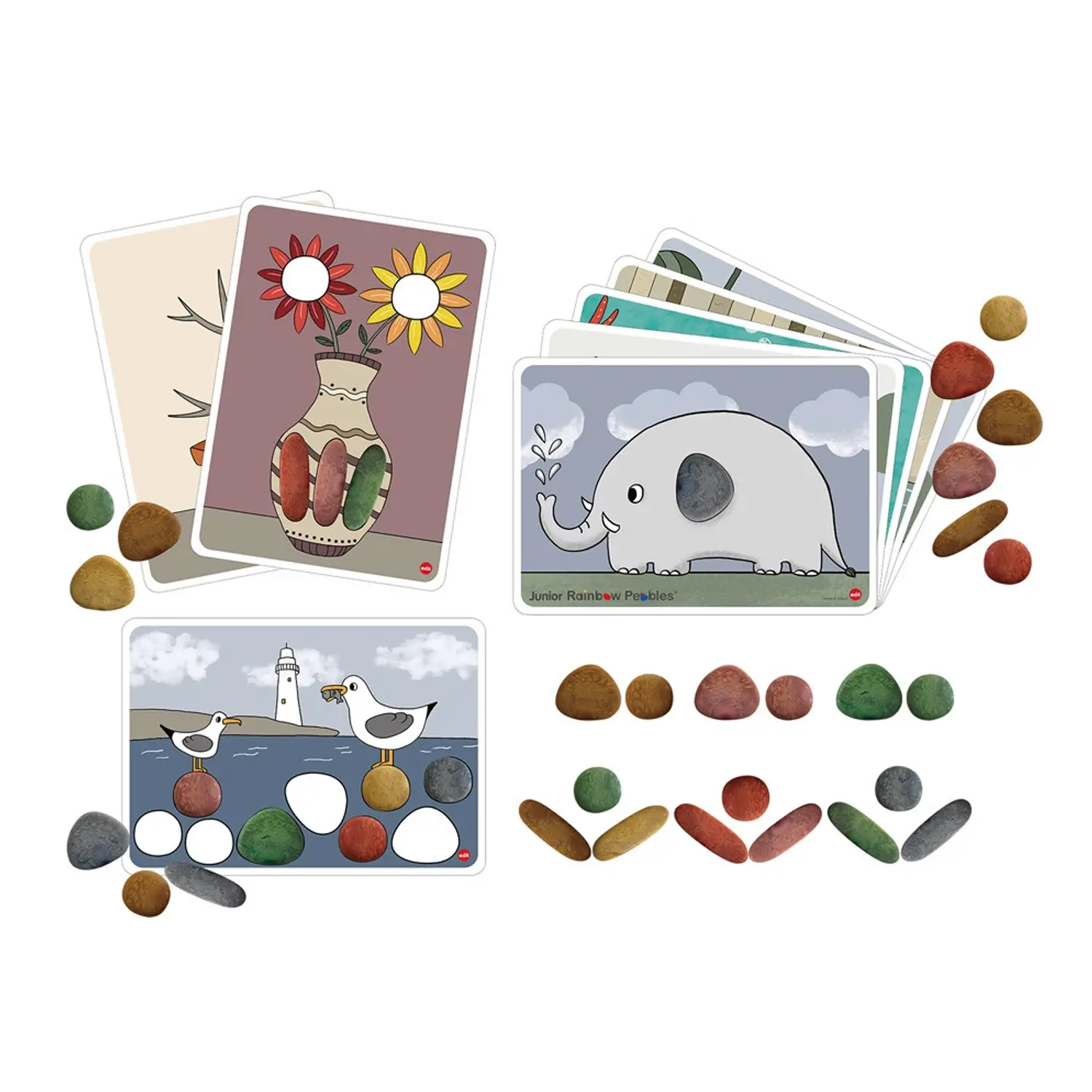 - Contenuto: 36 ciottoli in 3 forme e 6 colori + 8 schede modello bifacciali