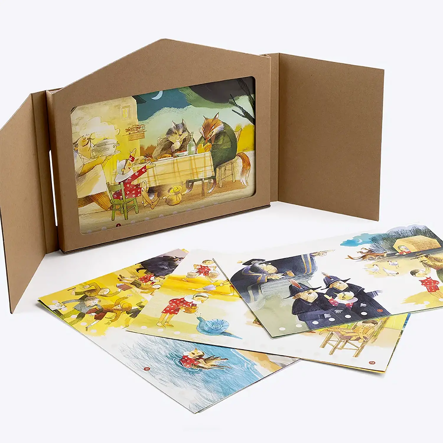 Teatro di carta giapponese interattivo Basato sull’antico Kamishibai, permette all’adulto di leggere il testo sul retro delle tavole mentre i bambini osservano le illustrazioni, creando un’esperienza immersiva e dinamica.