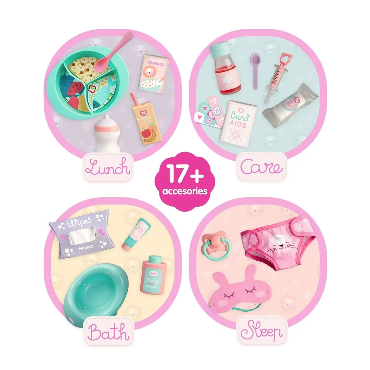 Accessori inclusi Il set contiene 17 accessori per ampliare il gioco: piatto baby, cucchiaio, biberon, medicinali e altri elementi per ricreare momenti di cura e alimentazione. Perfetto per un’esperienza di gioco realistica e coinvolgente.