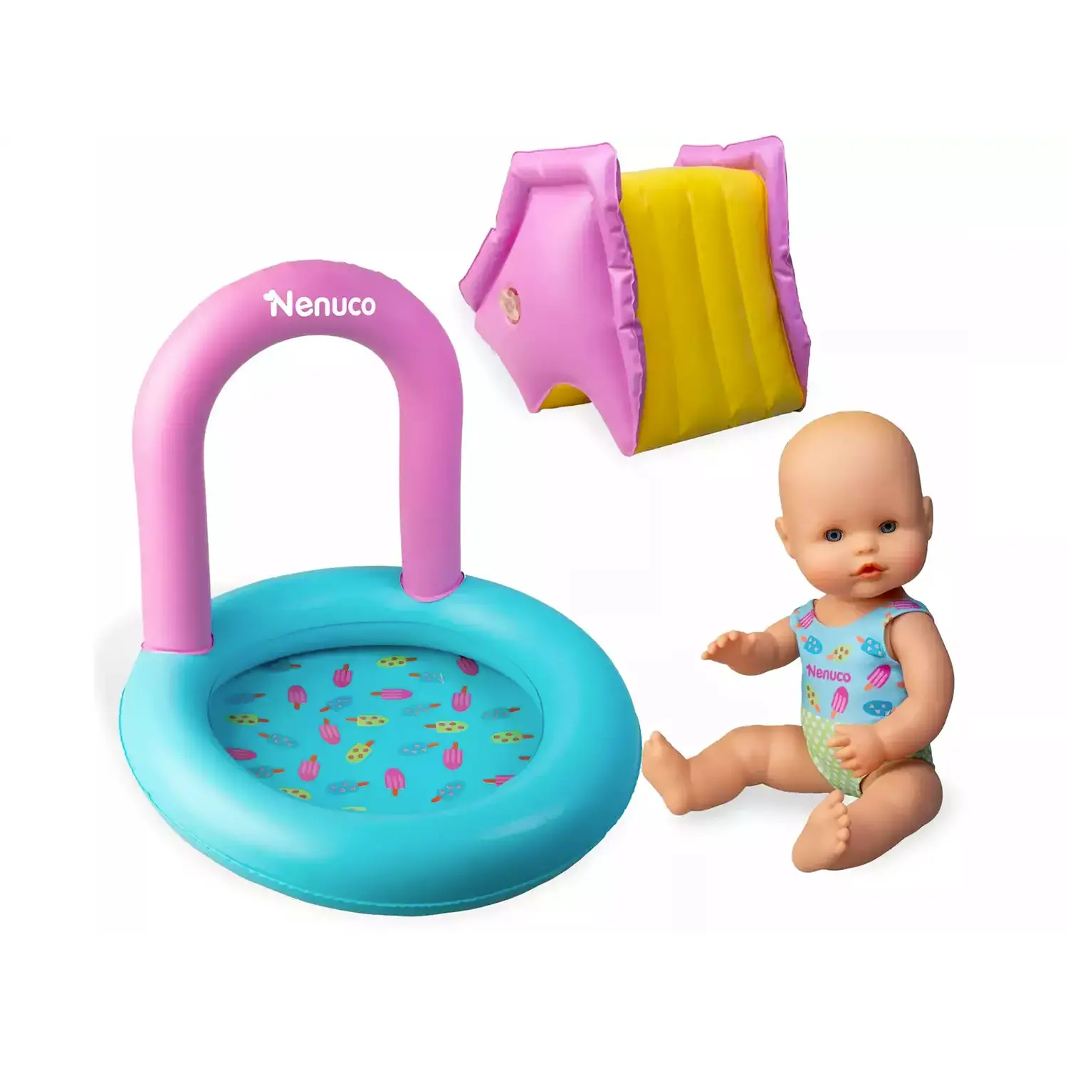 Bambola Nenuco snodabile e realistica Il set include una bambola Nenuco da 32 cm, con occhi blu, ciglia vere e un costume da bagno blu e verde con stampa a gelato, perfetta per il gioco all’aperto e in acqua.