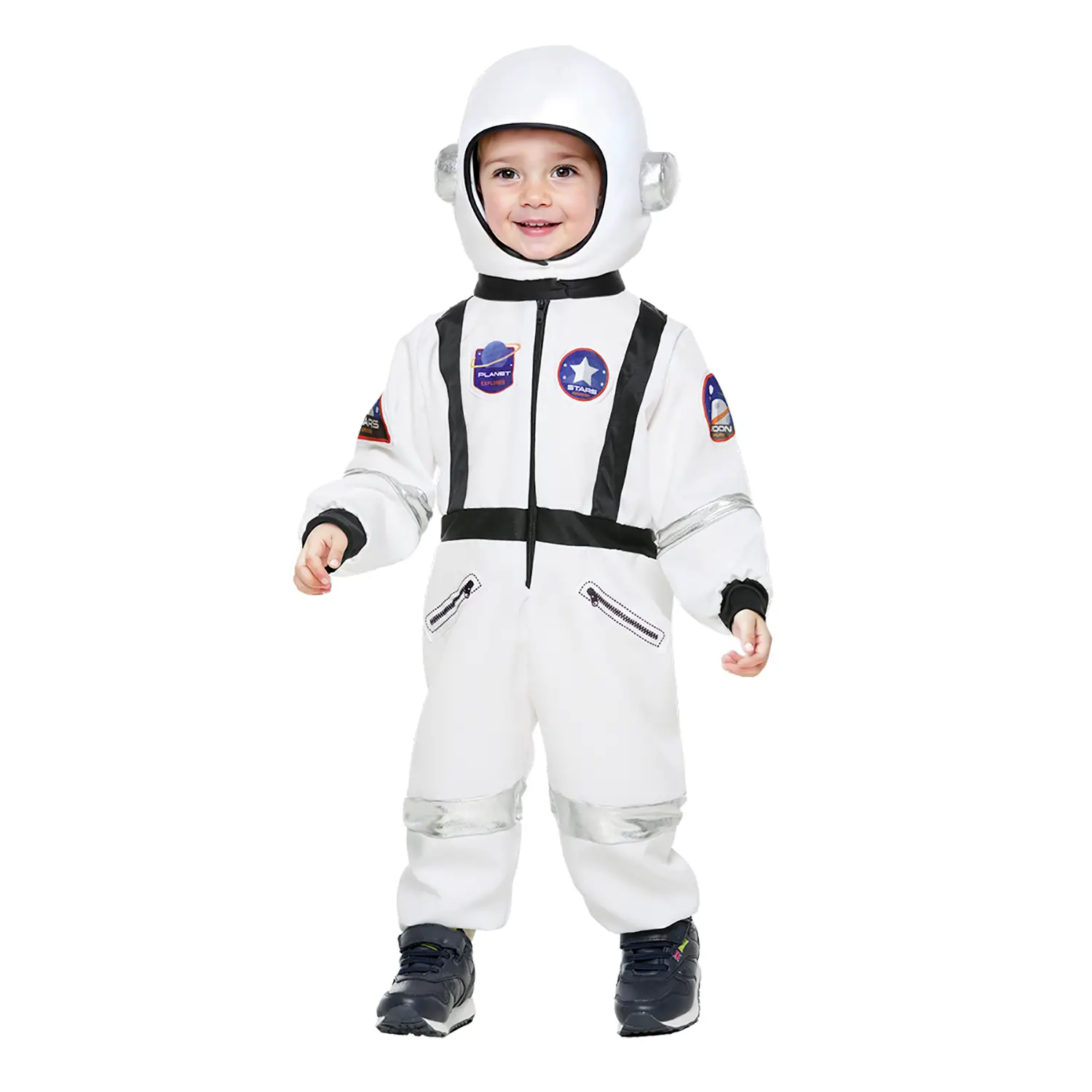 Design realistico e curato nei dettagli La tuta bianca con inserti argentati e patch spaziali richiama le vere divise degli astronauti NASA-style. Il casco abbinato completa l’uniforme per un look da piccolo esploratore stellare.