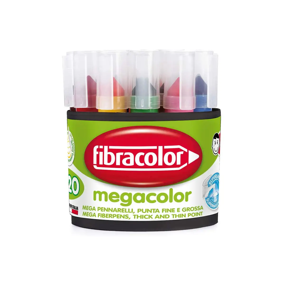 Scopri i pennarelli Megacolor di Fibracolor: un set da 20 pennarelli con fusto extra-large e punta conica doppio tratto (2-12 mm), ideali per le mani dei più piccoli. Perfetti per sviluppare la motricità fine, stimolare la creatività e avvicinare i bambini alla scrittura, sono pensati per un uso sicuro e versatile nella Scuola dell’Infanzia.