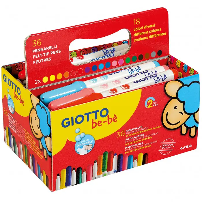 Colora in libertà e sicurezza! Il set Giotto Bebè da 36 pennarelli in 18 colori è pensato per accompagnare i bambini nel loro primo approccio al disegno, stimolando fantasia e motricità fine con la massima protezione.
