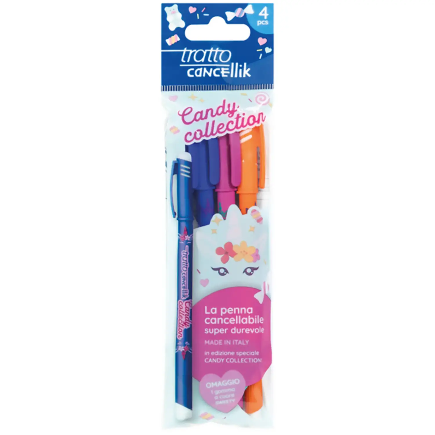 - ✅ Set Candy Collection con 4 penne Tratto Cancellik: 2 blu, 1 fucsia, 1 arancione in una pratica bustina.