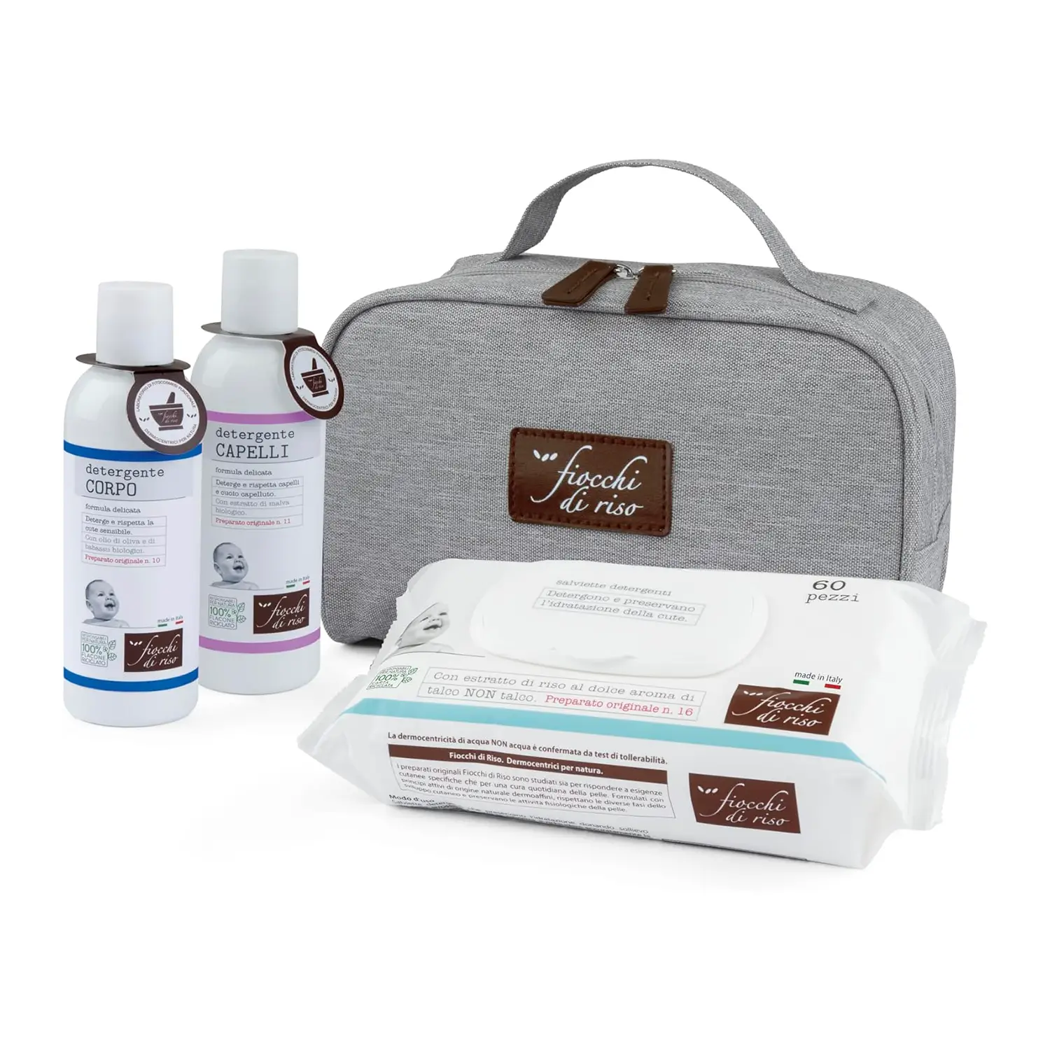 Il Cofanetto Bagnetto Delicato Fiocchi di Riso offre una soluzione completa e delicata per la cura quotidiana dei bambini. Comprende tre prodotti essenziali: Detergente Corpo, Detergente Capelli, e Salviette Umidificate ACQUA NON ACQUA, ideali per la pelle sensibile dei neonati. Ogni prodotto è formulato con ingredienti di origine naturale e principi attivi vegetali, garantendo una detersione delicata e sicura fin dalla nascita.