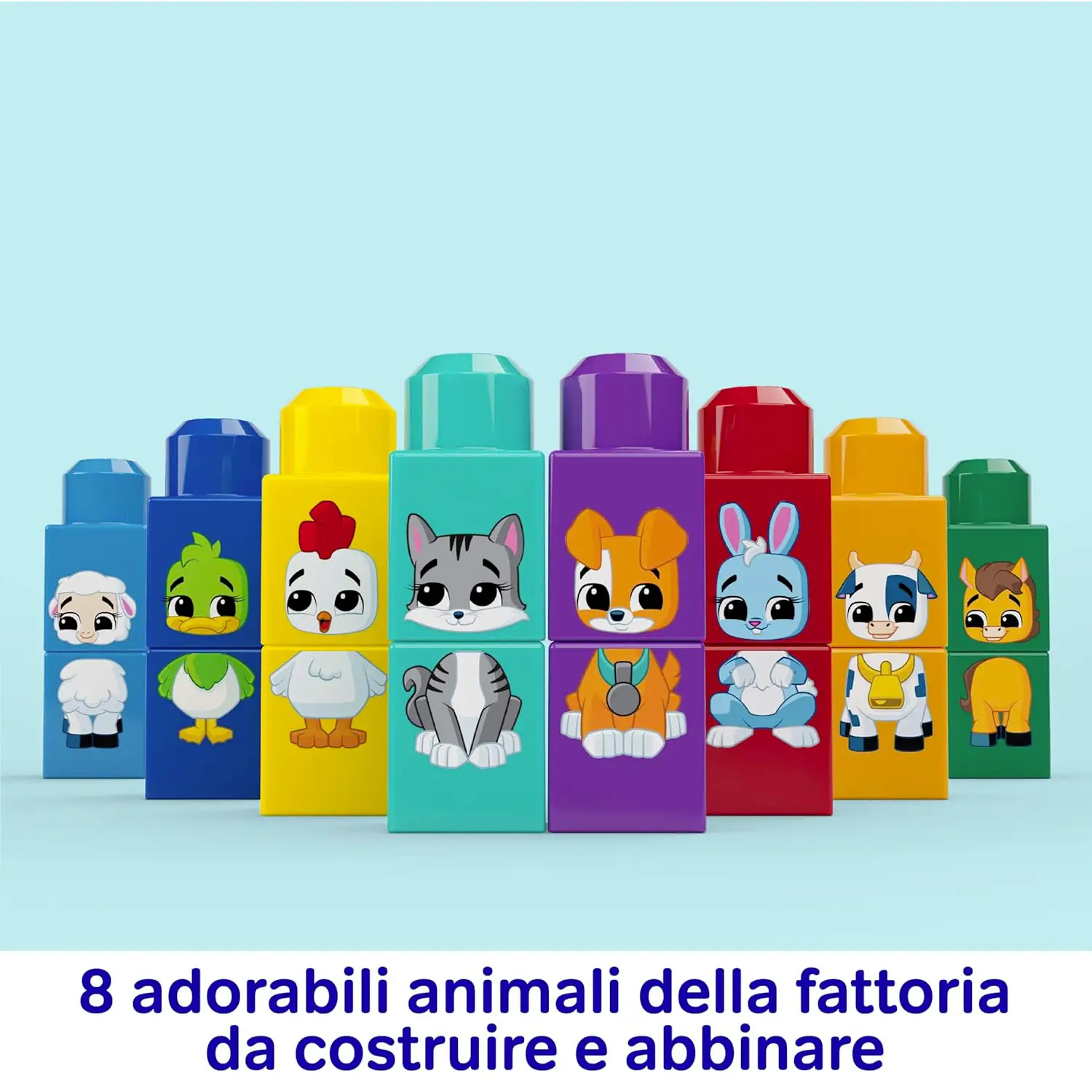 Scopri Animali e Colori I blocchi presentano 8 animali della fattoria che i bambini possono impilare e abbinare, imparando a riconoscere forme e colori.