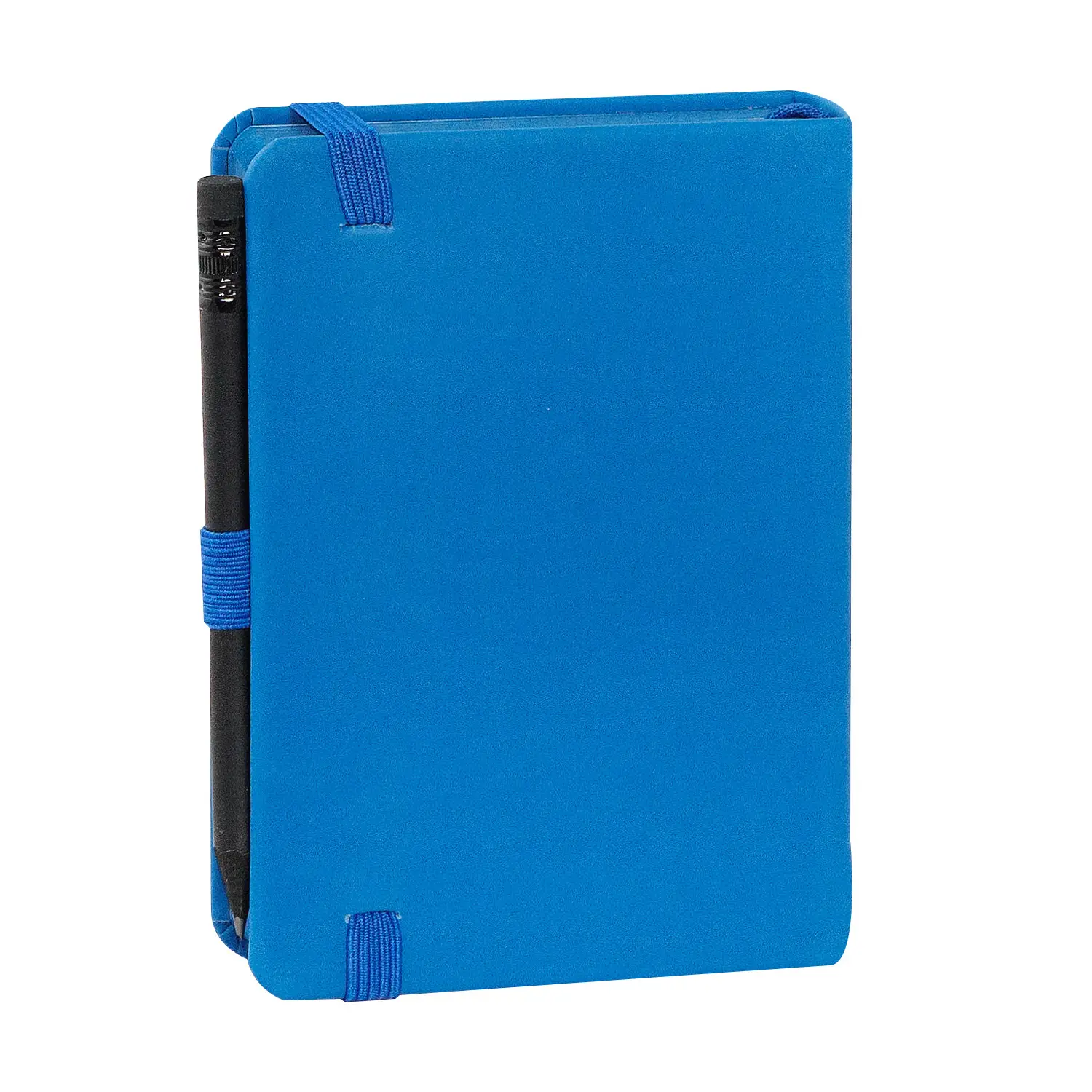 Design Blue elegante copertina in PU termovirante blu, con elastico large da 8 mm in tinta, doppio segnalibro e pratico passante elastico laterale per penna o matita. Inclusa una matita Comix coordinata.