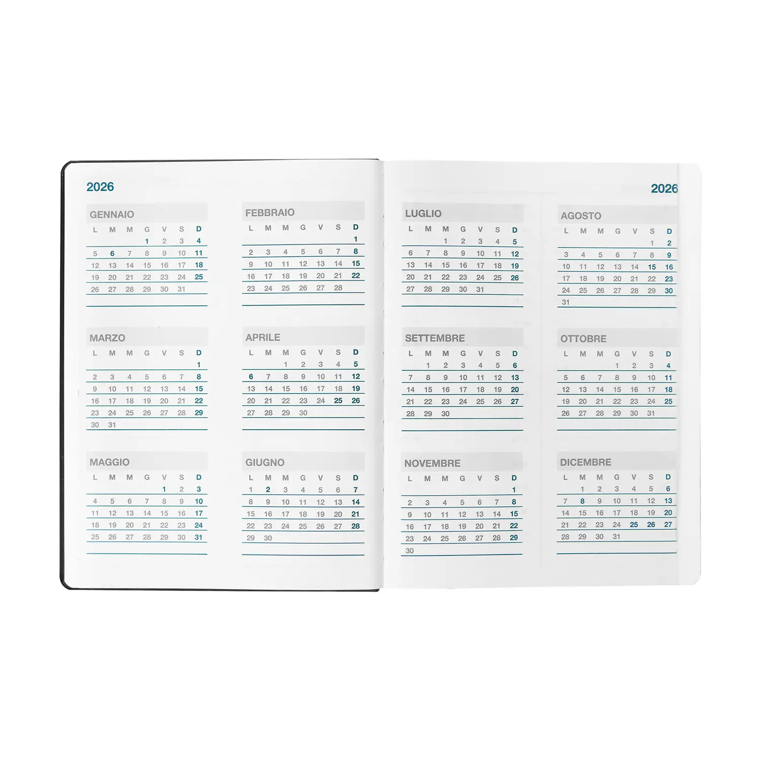 192 pagine settimanali dal 1° gennaio al 31 dicembre 2026, con layout verticale che permette una visione chiara e completa della settimana.