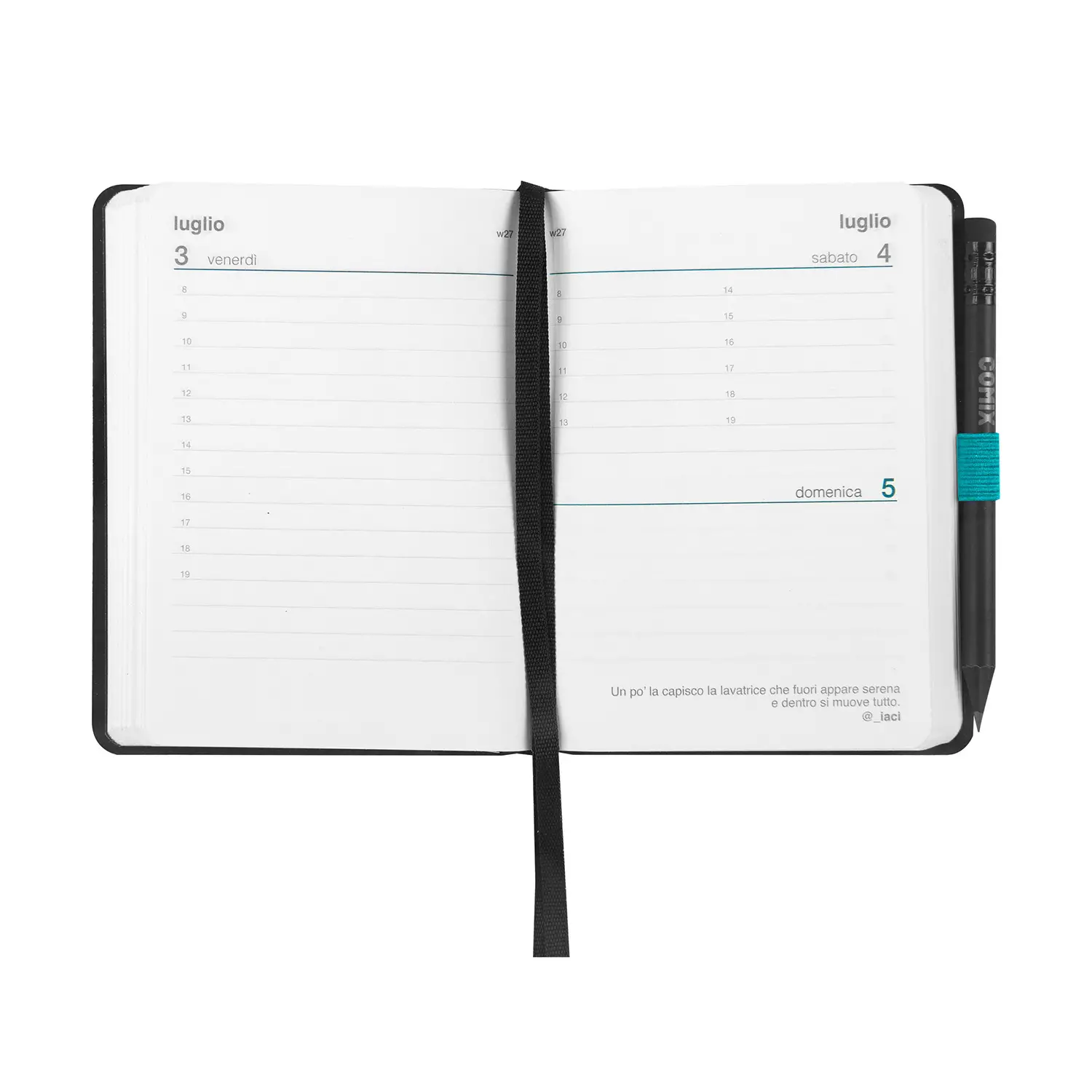 Formato Mignon compatto dimensioni 9 x 12,5 cm, pratico e maneggevole, perfetto per chi desidera un’agenda leggera da portare sempre con sé nello zaino, in borsa o nello zainetto.