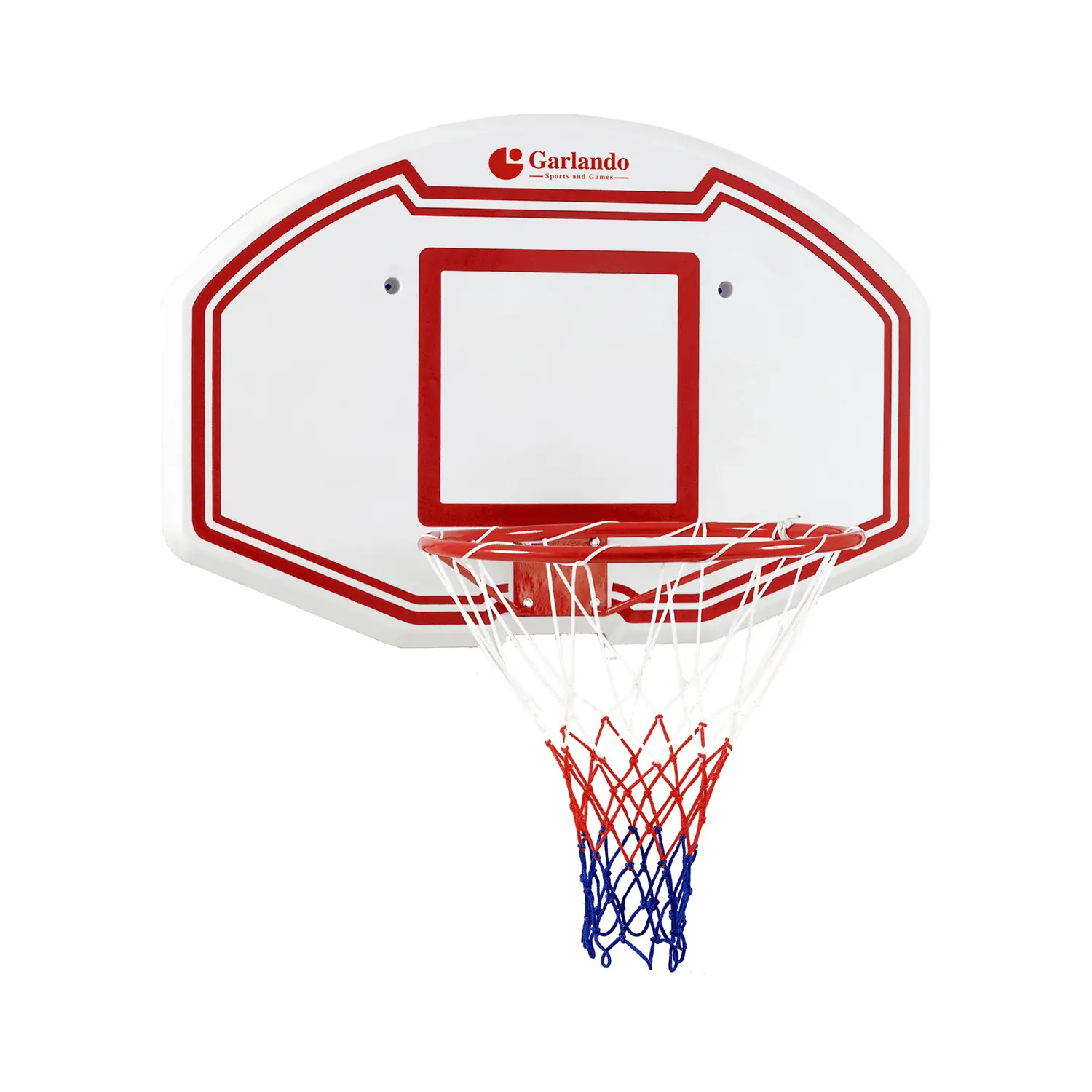 Design accattivante: il tabellone presenta linee rosse su uno sfondo bianco per una visibilità ottimale. Il canestro in acciaio verniciato di colore rosso con cerchio fisso Ø 45 cm e rete in polipropilene per esterni completa l’estetica e la funzionalità del prodotto.