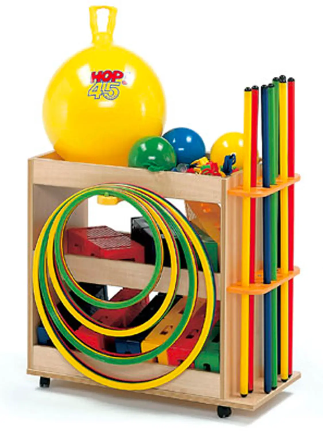 Organizzazione efficiente: Attrezzato con portabastoni e portacerchi, consente di riporre in modo sistematico ed ordinato tutto il materiale per le attività motorie.