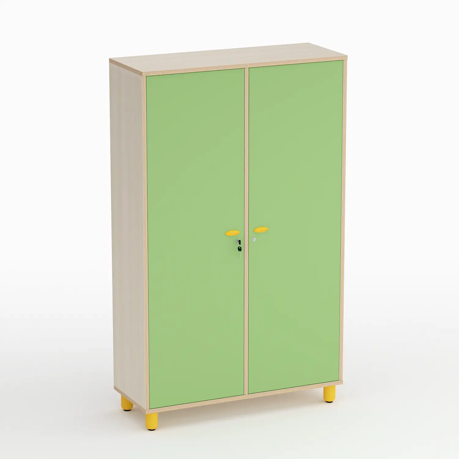 - Ante Colorate e Funzionali: Dotato di ante con sagoma ad onda, cerniere trasloratorie in acciaio, maniglie incassate a conchiglia in PPL colorato e serratura tipo Yale con chiave snodata antinfortunistica per la massima sicurezza.