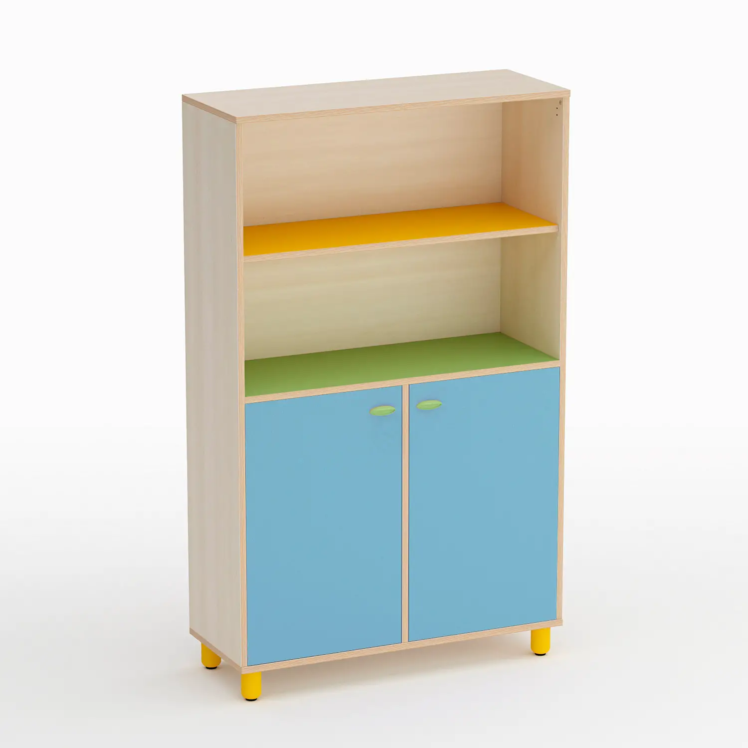 - Parte Inferiore Protetta: Ante colorate con sagoma ad onda, cerniere trasloratorie in acciaio, maniglie incassate a conchiglia in PPL colorato e serratura tipo-Yale con chiave snodata antinfortunistica.