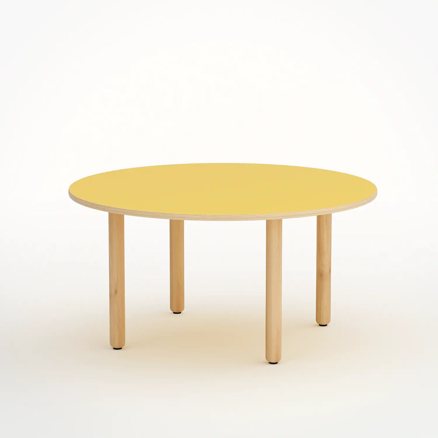 Il Tavolo Onda Circolare H 55 Cm - Misura 3 - Giallo è realizzato con multistrato di betulla e bilaminato plastico antigraffio. Gambe in faggio massello con gommini antisdrucciolo. - Conforme CAM Criteri Ambientali Minimi