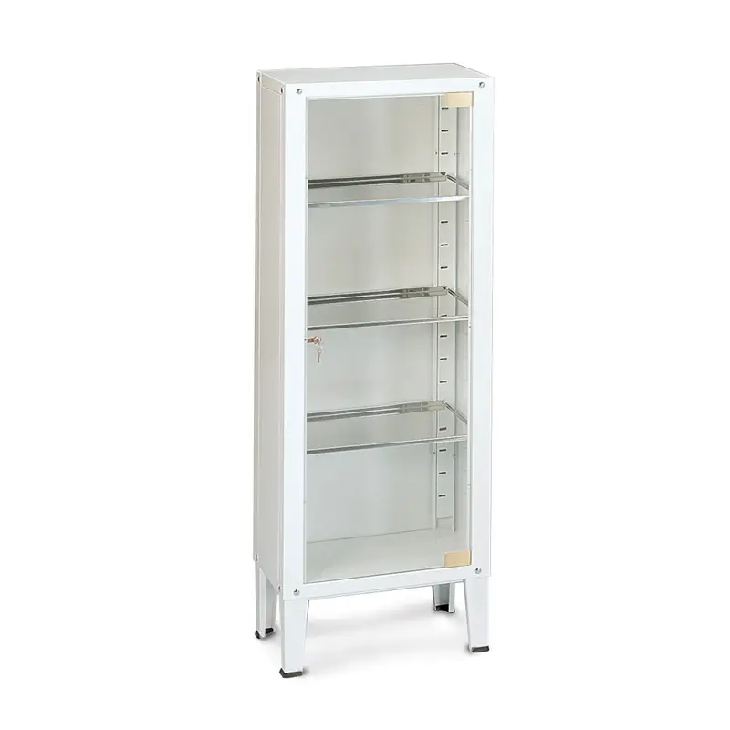 Armadi costruiti in lamiera di acciaio verniciato a polveri. Porte a cerniera in vetro temperato, conformi alle vigenti leggi, con serratura e battenti su guarnizione in gomma. Piani in lamiera di acciaio inox regolabili su cremagliere. Disponibili in tre diversi modelli.