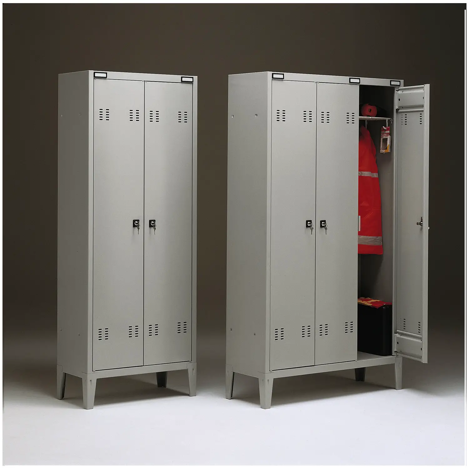 L’Armadio Spogliatoio 2 Posti di GIODICART è costruito in lamiera spessa, verniciata grigio RAL 7035, con serrature sicure e antiscasso per una protezione ottimale.
