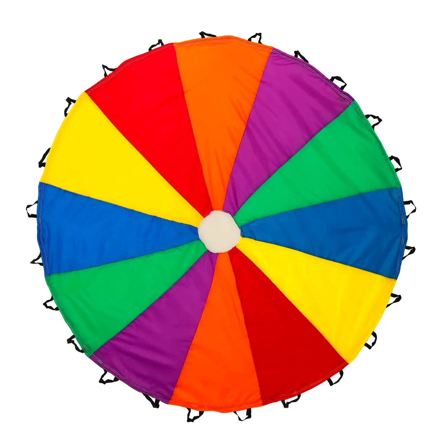 Paracadute in tessuto di poliestere a settori colorati con bordi rinforzati e 24 maniglie. Ideale per realizzare attività e giochi in gruppi ristretti di bambini, per stimolare l’attività motoria e la coordinazione, poiché coinvolge movimenti dinamici che promuovono lo sviluppo delle abilità motorie e la coordinazione corporea. Inoltre incoraggia l’interazione e la collaborazione di gruppo.