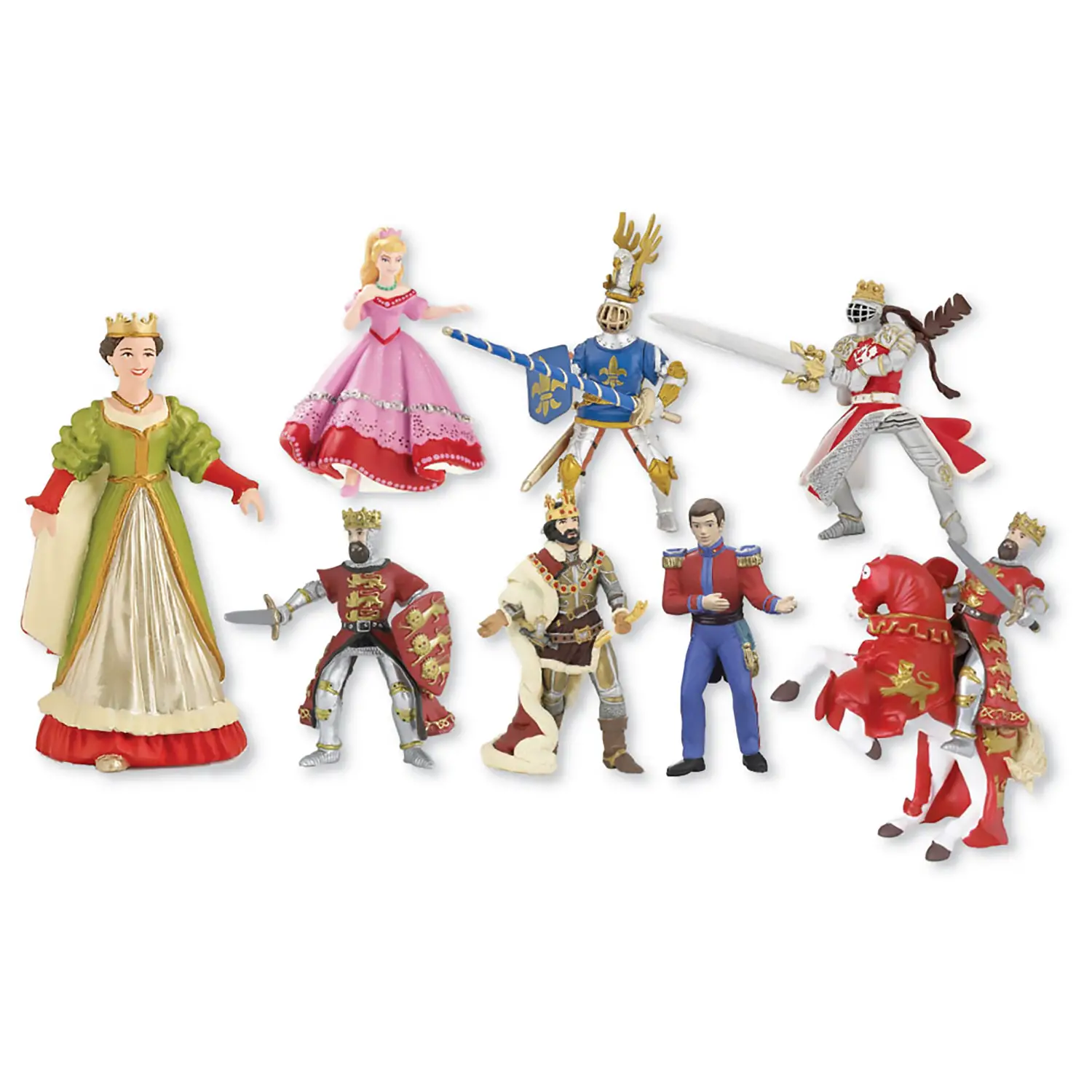 - Set Completo: Il set include dieci personaggi medievali: un principe, un re, una regina, una principessa, quattro cavalieri e due destrieri.