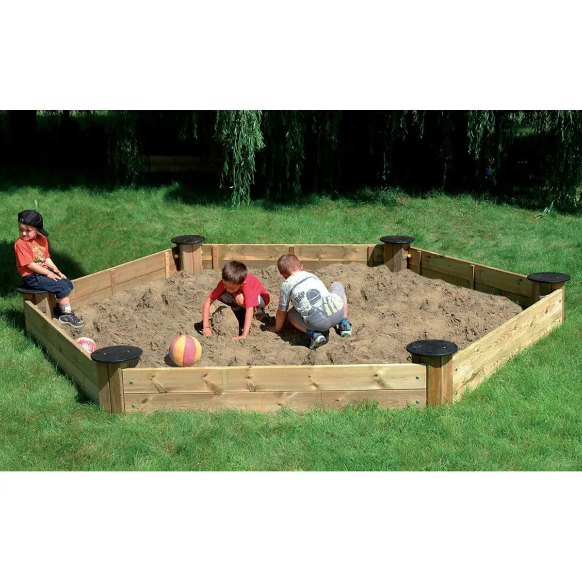 Costruzione Robusta e Sicura: Questa sabbiera esagonale è realizzata con profili di legno massello trattato in autoclave, assicurando durabilità e resistenza agli agenti atmosferici. Le pareti spesse 15x3,5 cm e gli angoli robusti con pali da 18x18 cm garantiscono una struttura solida e sicura per il gioco dei bambini.