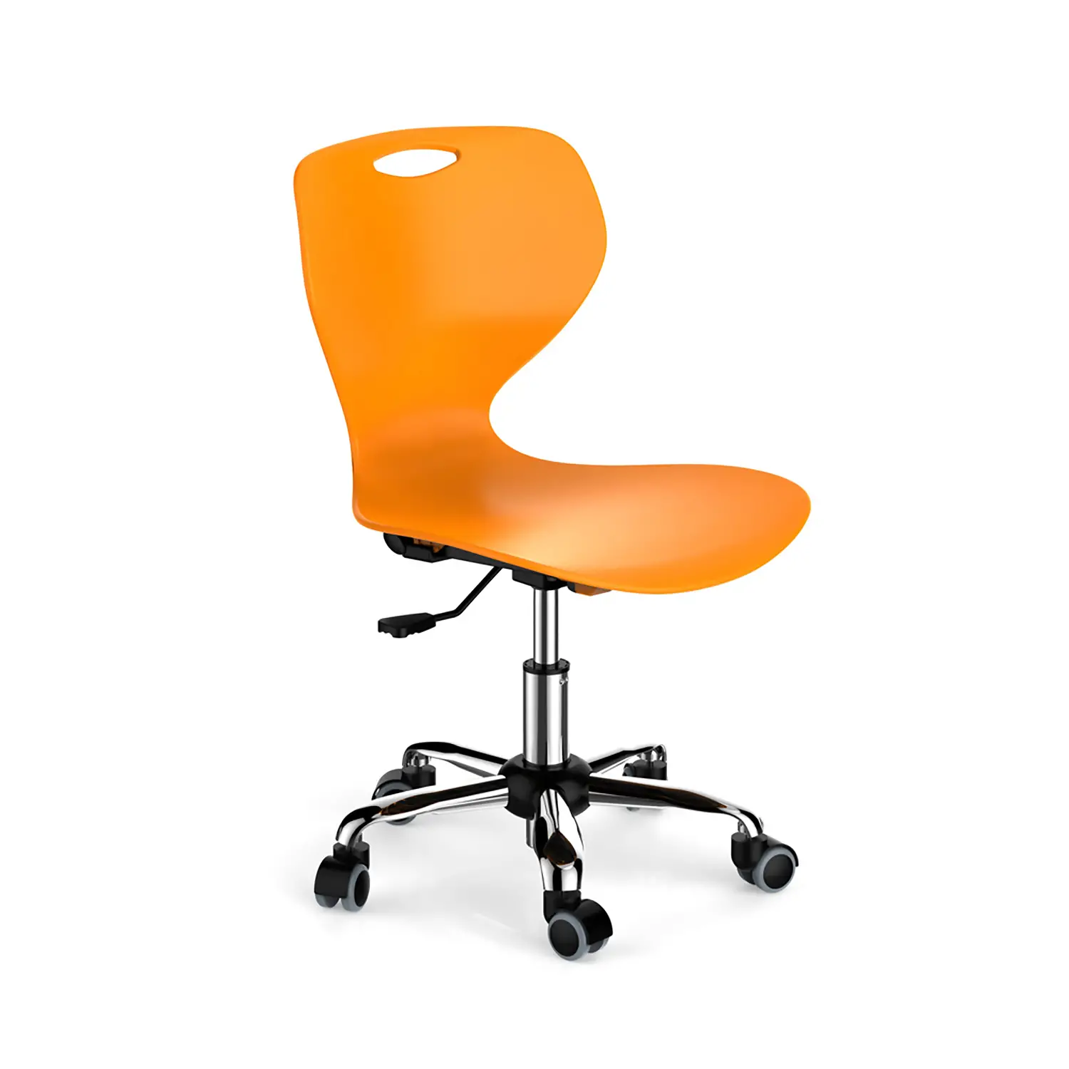 Scocca monoblocco ergonomica in resistente polipropilene colorato di alta qualità. Regolazione dell’altezza a pistone su base in acciaio cromato a 5 razze con ruote rivestite in gomma antigraffio e antirumore.