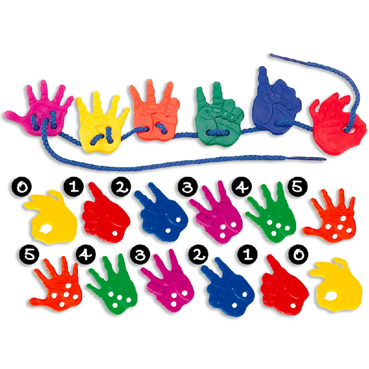 - Infilo e Conto: Infila le stringhe attraverso i fori delle manine corrispondenti per esercitare motricità e apprendimento numerico.