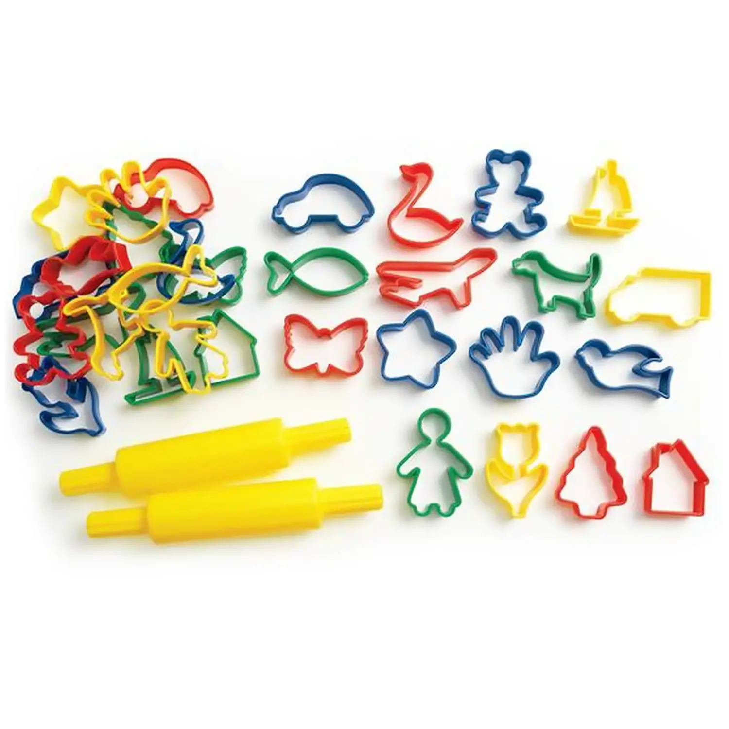 - ✅ Set completo di 34 pezzi con stampini e mattarelli, assortiti in 6 soggetti diversi per stimolare la creatività dei bambini.