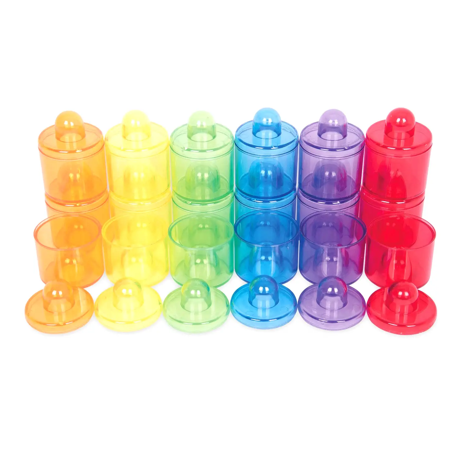 Un set colorato, versatile e stimolante, composto da 18 vasi piccoli impilabili in sei brillanti colori traslucidi (rosso, arancione, giallo, verde, blu e viola). Ogni vaso è dotato di coperchio, ideale per attività di travaso, classificazione cromatica, giochi di impilamento e scoperta sensoriale.