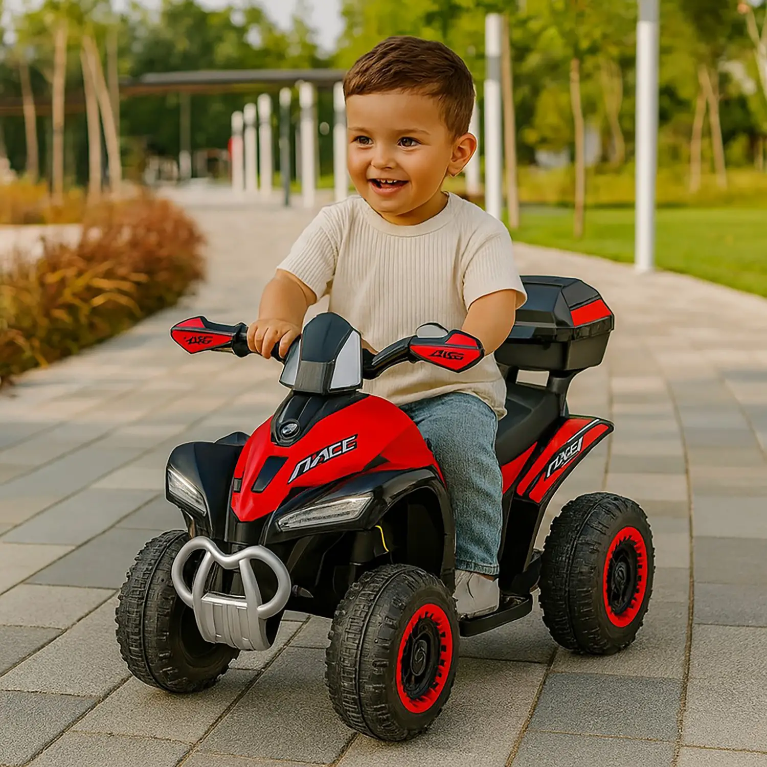 Il Mini Quad Race presenta un look grintoso e moderno, pensato per accompagnare i bambini in avventure sicure e divertenti. La struttura stabile e le forme ergonomiche stimolano autonomia, coordinazione e capacità motorie nei più piccoli.