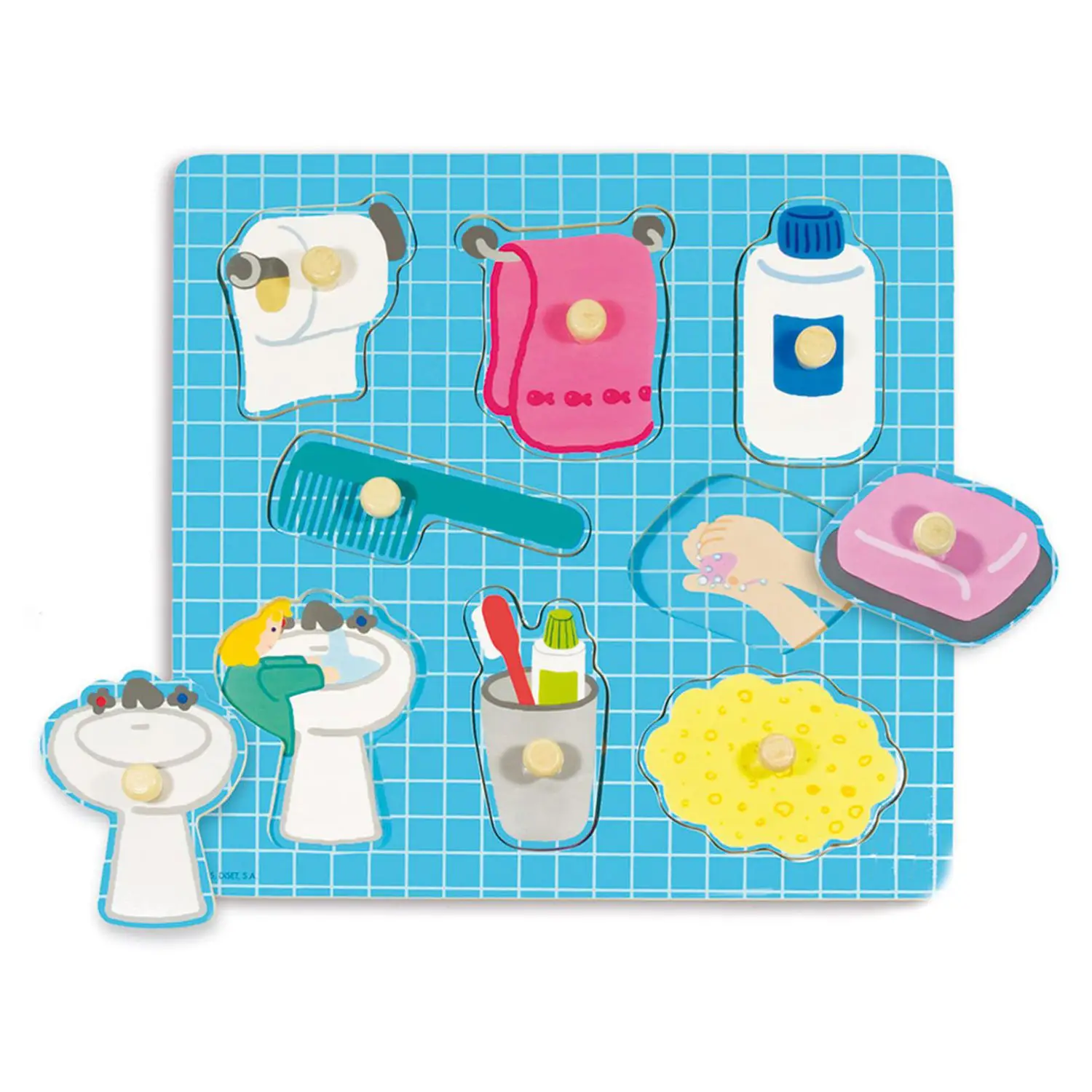 Il Gioco Incastri delle Scoperte: In Bagno è un gioco educativo in legno che permette ai bambini di esplorare e apprendere attraverso il gioco interattivo. Con tessere sagomate dotate di pomoli e una tavola in legno, i piccoli possono scoprire oggetti e ambienti familiari presenti nel bagno, stimolando curiosità, creatività e abilità cognitive.