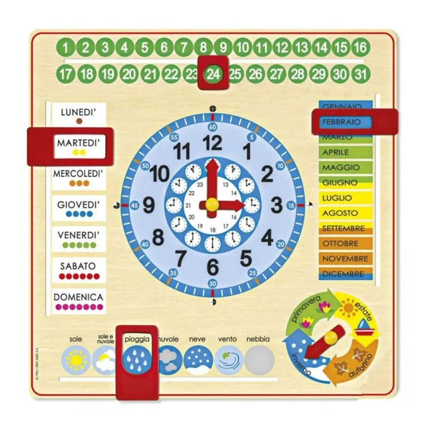 - ✅ Calendario-orologio in legno per apprendere giorno, mese, stagione e meteo.