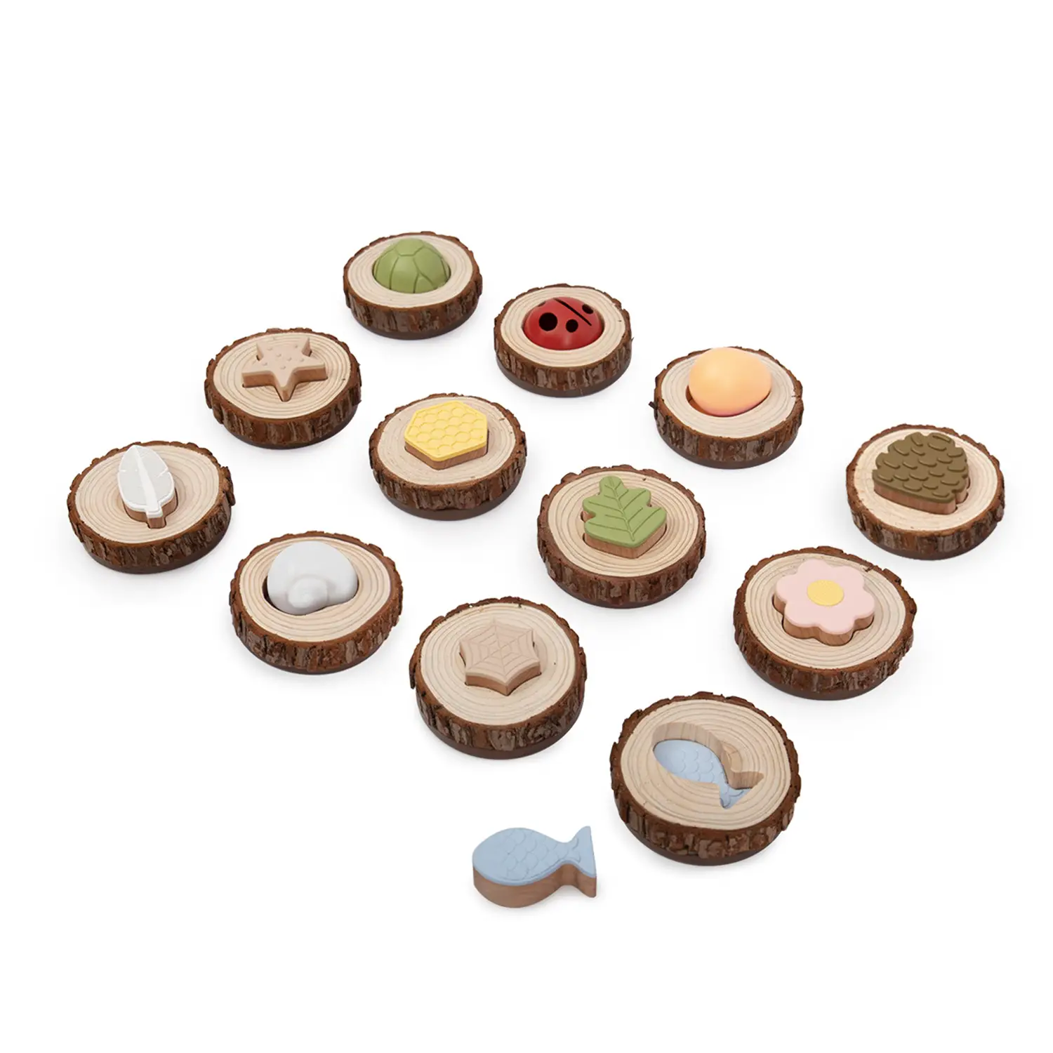 - Materiali Naturali e Sicuri: Il gioco include 12 tronchetti veri di dimensioni adeguate per mani piccole, e 12 forme in plastica sicura, perfetta per il gioco sensoriale.