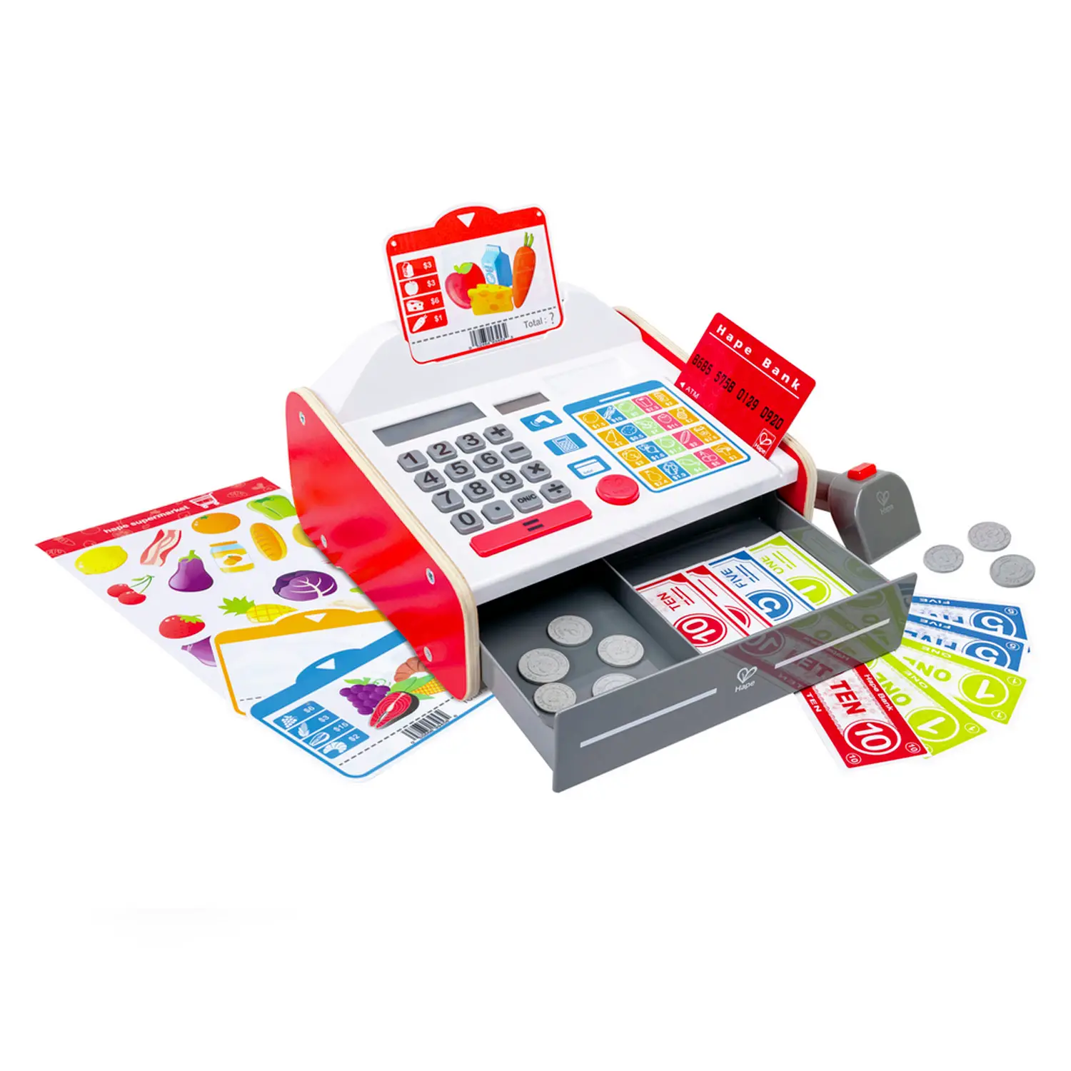 Si tratta di un registrtore di cassa giocattolo dotato di una calcolatrice funzionante alimentata a energia solare, un lettore scanner con luci e suoni, monete e banconote, una carta di credito e altri accessori. Il gioco aiuta i bambini a imparare il valore del denaro, la matematica di base e le abilità sociali, simulando il ruolo di un cassiere o di un cliente nel gioco simbolico. La cassa supermercato è adatta ai bambini dai 3 anni in su, ed è realizzata con materiali di alta qualità e vernici atossiche.