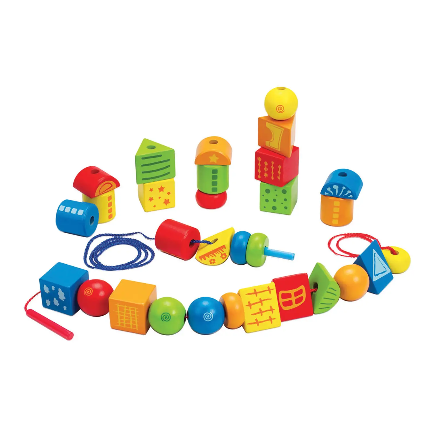 Le Forme da Infilare e Trainare sono un gioco educativo e divertente che stimola la manipolazione, la creatività e l’apprendimento dei bambini. Il set comprende 32 pezzi tra perle giganti colorate e forme assortite in legno decorato, insieme a un laccio con punte in legno per assemblare trenini, torri, personaggi e molto altro.