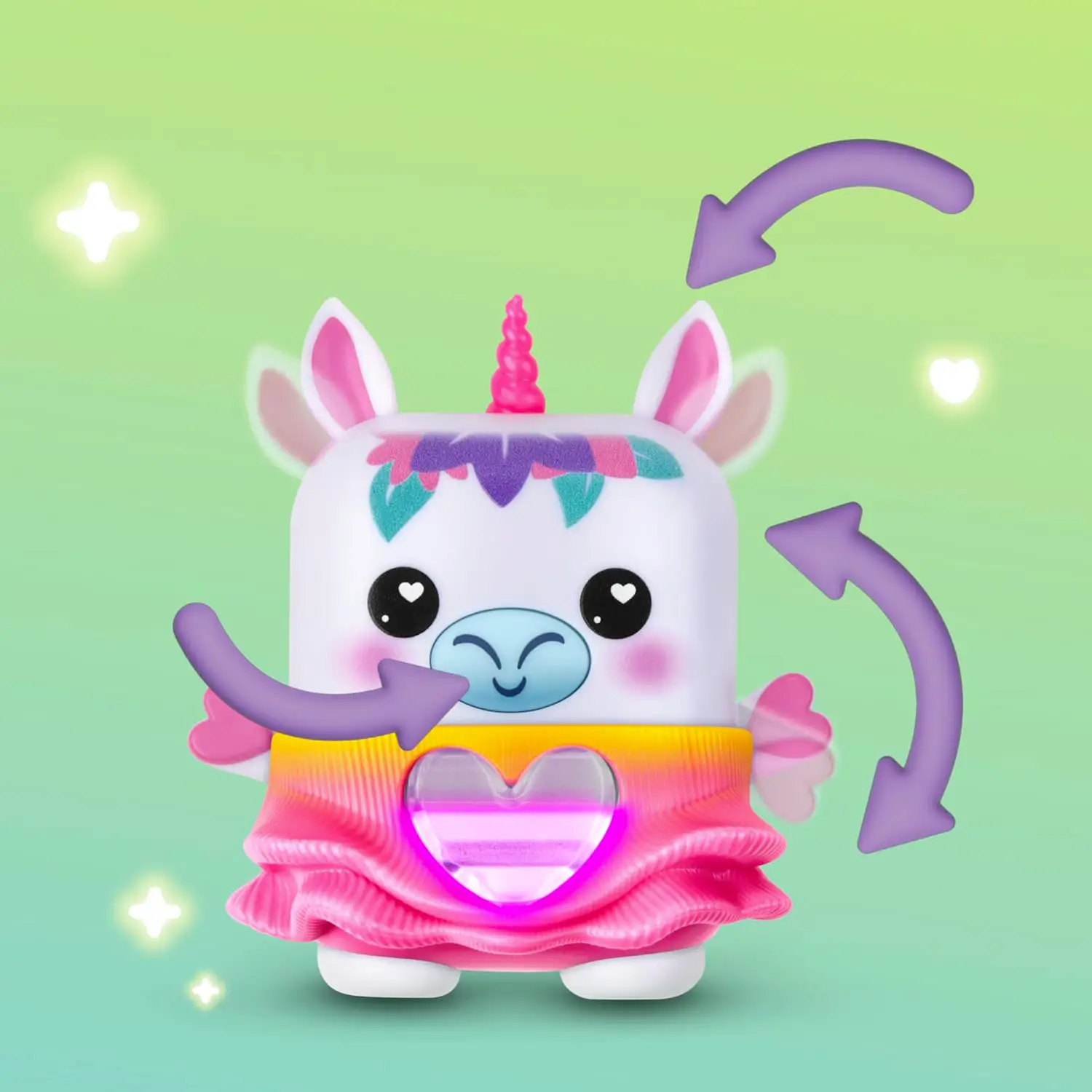 Oltre 70 Suoni e Reazioni Questo unicorno elettronico offre più di 70 risposte tra suoni, luci ed effetti. Quando il cuore luminoso si riempie completamente, si sbloccano una canzone esclusiva e uno spettacolo di luci colorate.