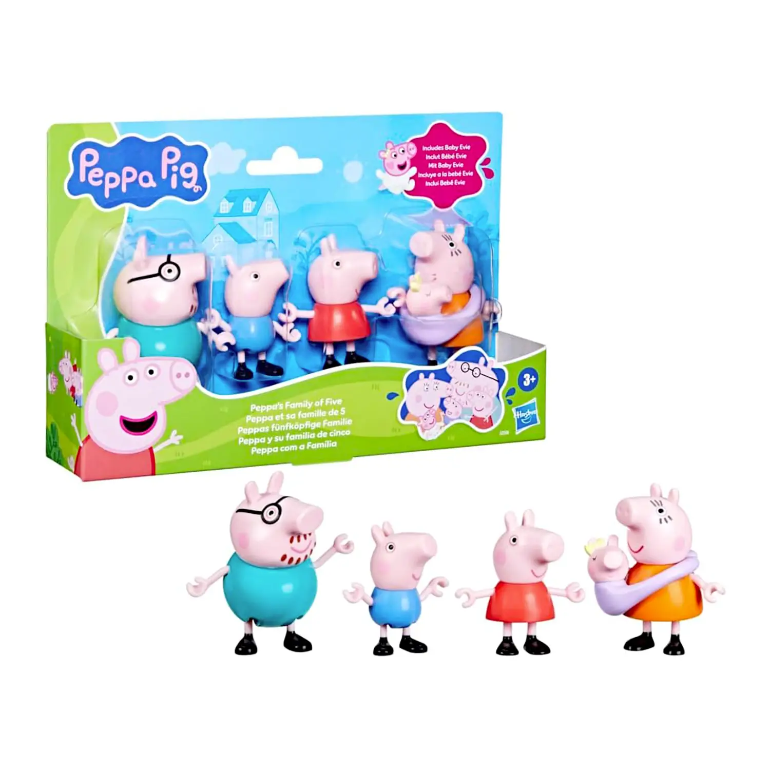 Espansione della famiglia Peppa Pig - Il set action figure Famiglia Peppa Pig amplia il gioco con Papà, Mamma, Peppa, George e Baby Evie nel marsupio. Figura amata dai fan, stimola l’immaginazione e crea nuove avventure in famiglia. Perfetto come regalo o integrazione a playset esistenti.
