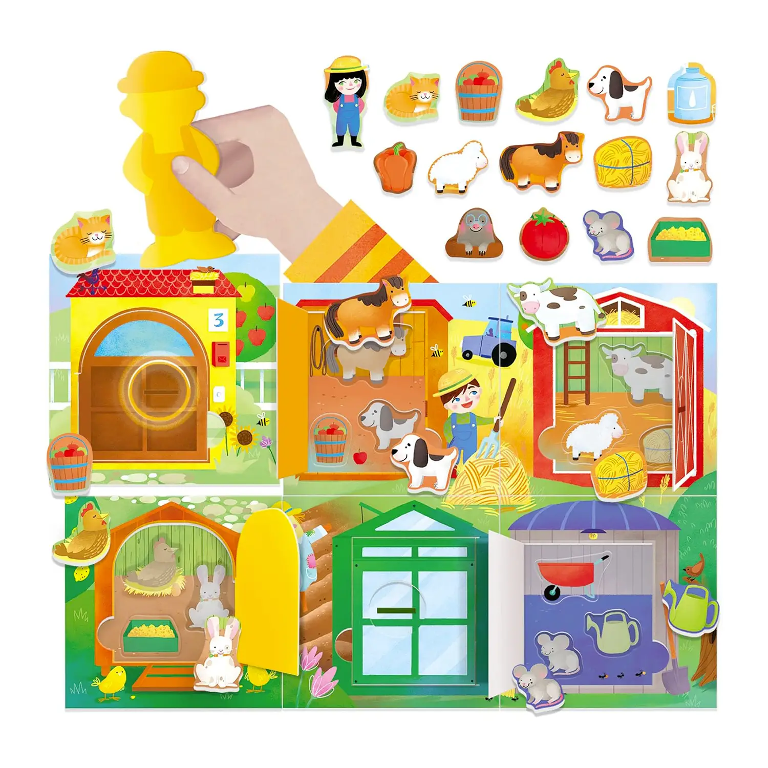 Attività coinvolgente e ricca di stimoli I bambini osservano, aprono e chiudono le cartelle della fattoria, riconoscono ambienti e oggetti e associano correttamente ogni sagoma. Un’attività che allena logica, memoria visiva e intelligenza visivo-spaziale, stimolando la capacità di deduzione.