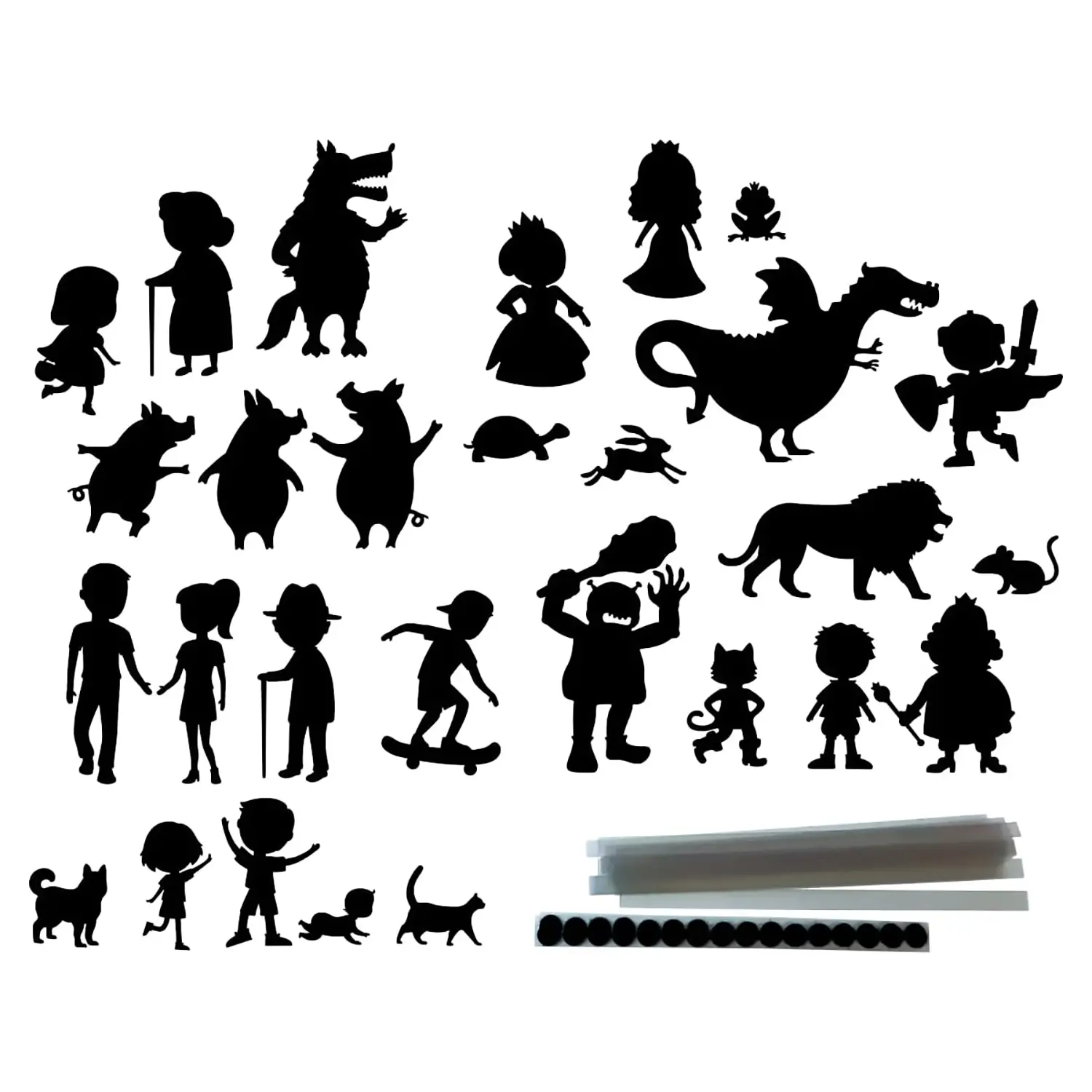 Una collezione di sagome dei personaggi protagonisti delle fiabe più conosciute per rappresentare favole tradizionali o storie inventate. Questo set di sagome, realizzate in plastica lavabile, è ideale per ampliare le capacità di espressione verbale e narrative dei bambini, incoraggiandoli a recitare storie familiari e a stimolare la loro immaginazione.