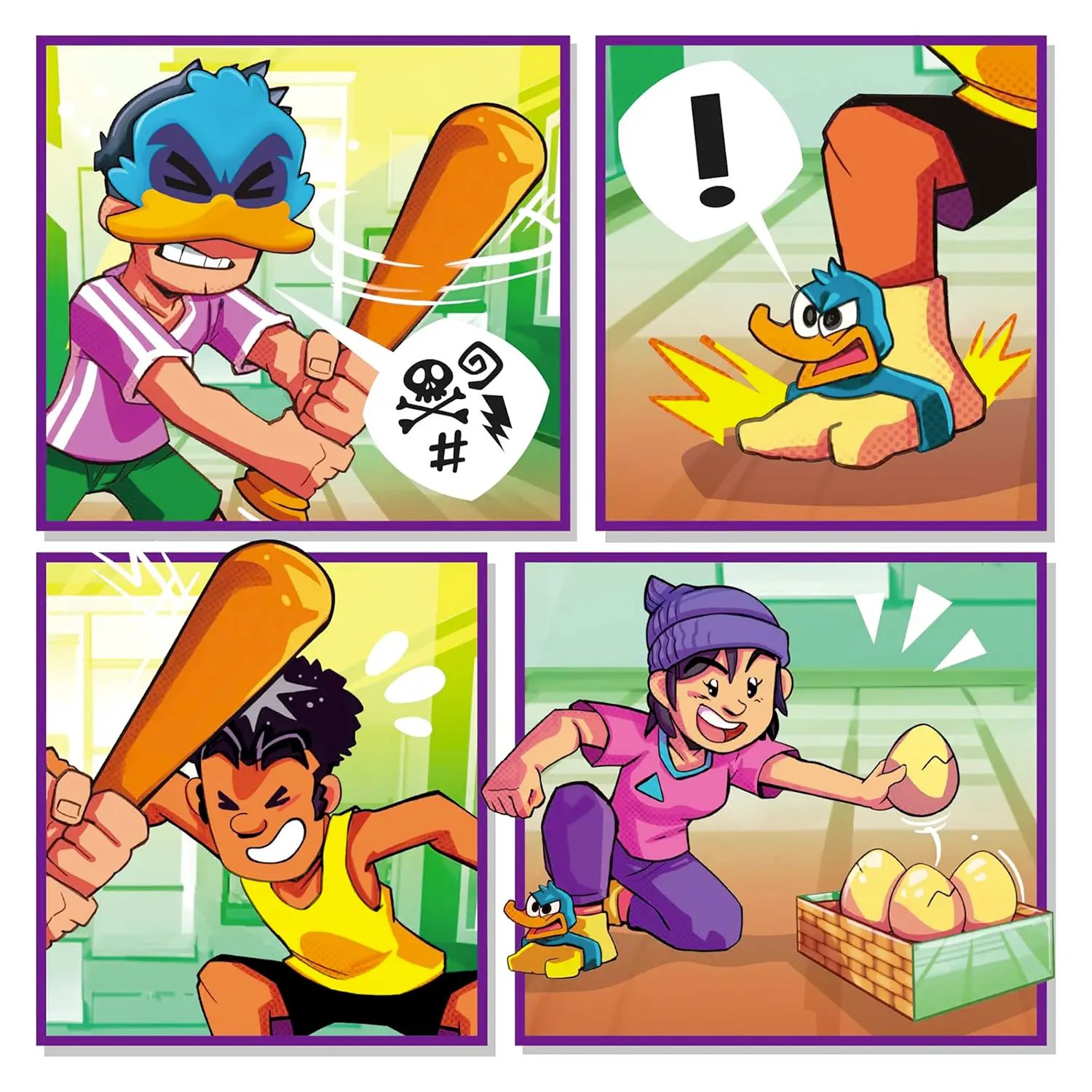 Difendi o Attacca: Un giocatore indossa la maschera da papera e impugna la mazza gonfiabile per difendere le uova, mentre gli altri – con buffe zampe fischianti ai piedi – cercano di rubarle muovendosi senza essere sentiti.