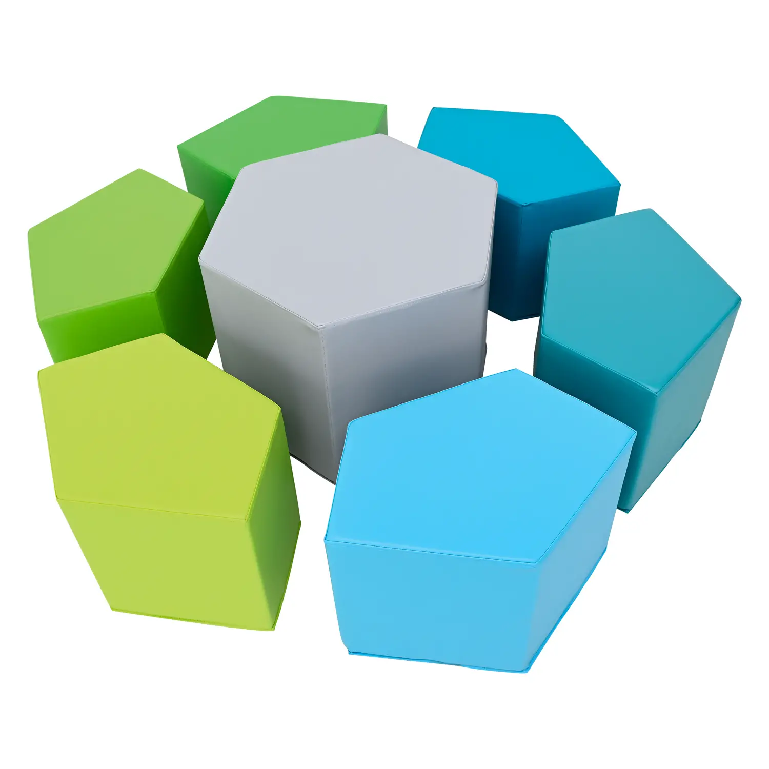 - ✅ Set di sedute pentagonali e tavolino esagonale per ambienti educativi innovativi.