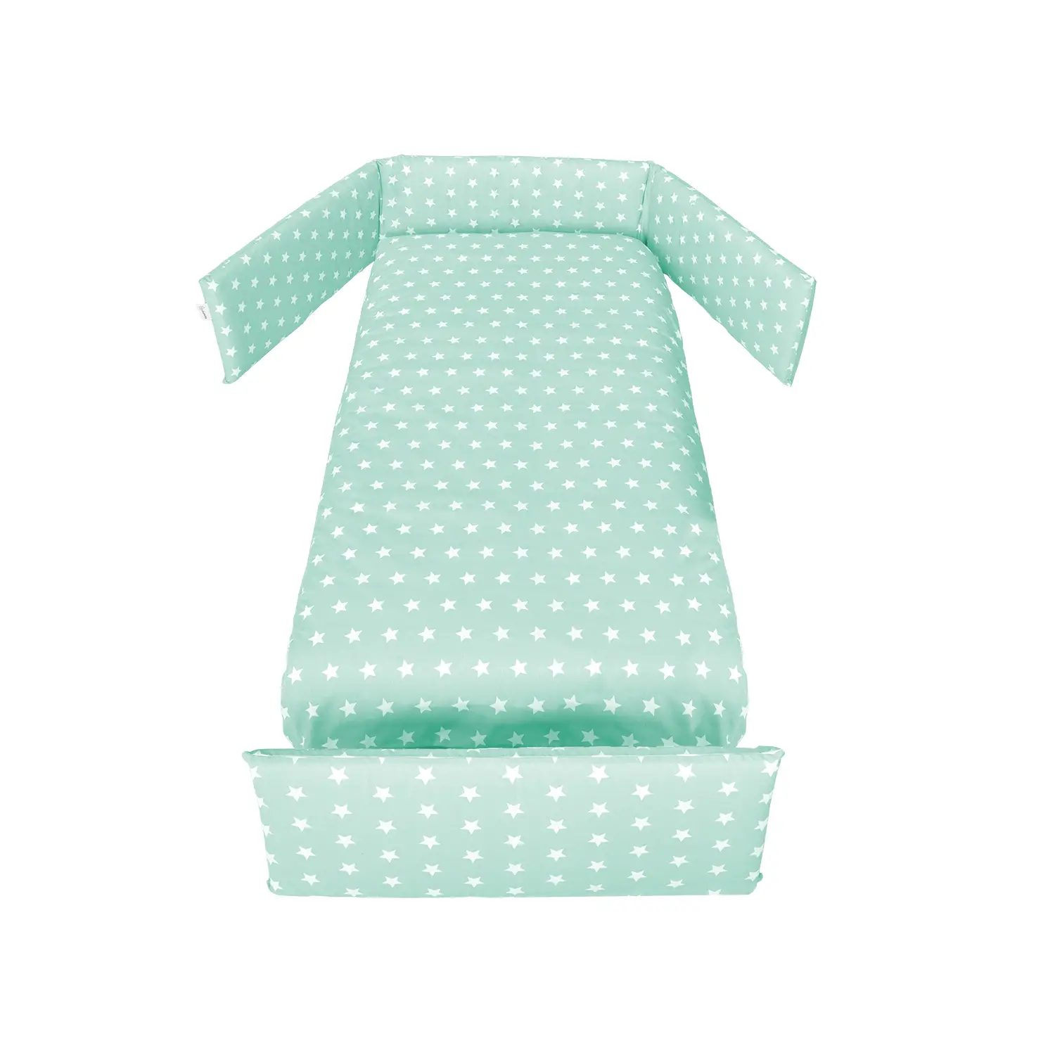 Paracolpi Modulabile per Sicurezza e Design Incluso nel set, il paracolpi modulabile si adatta dalla culla al lettino, garantendo protezione durante il sonno e aggiungendo un tocco decorativo alla testiera del letto. Il design coordinato con il tema Starlette Menta unisce funzionalità ed eleganza.