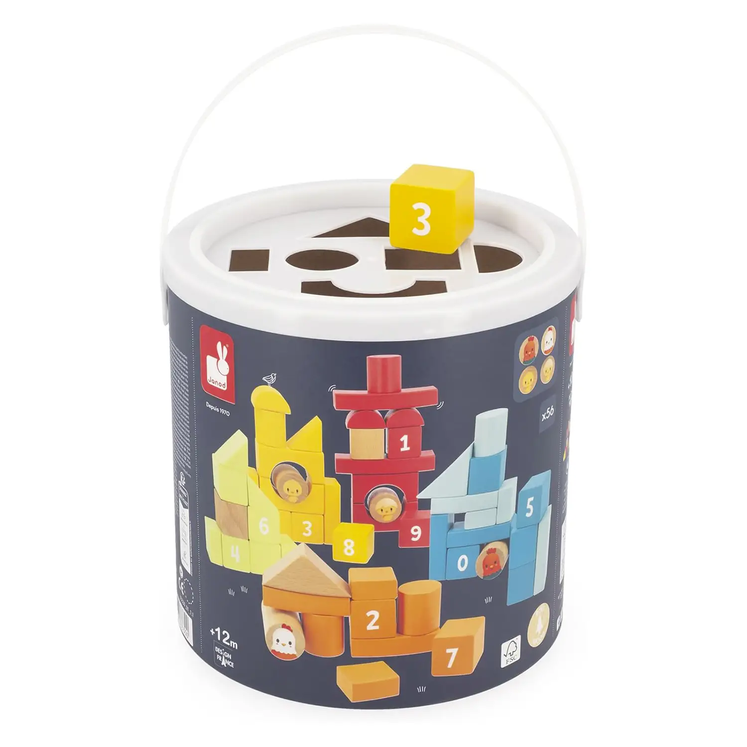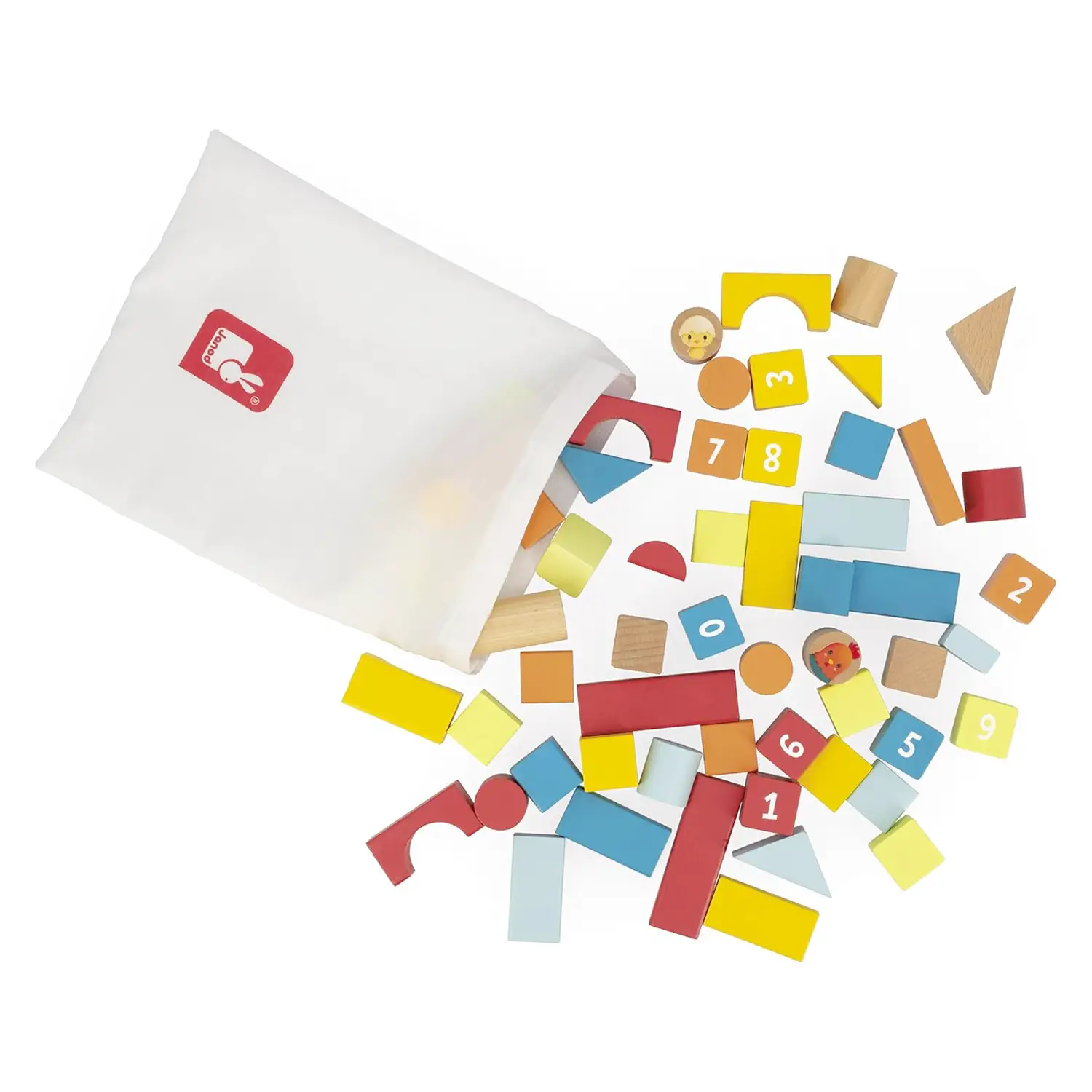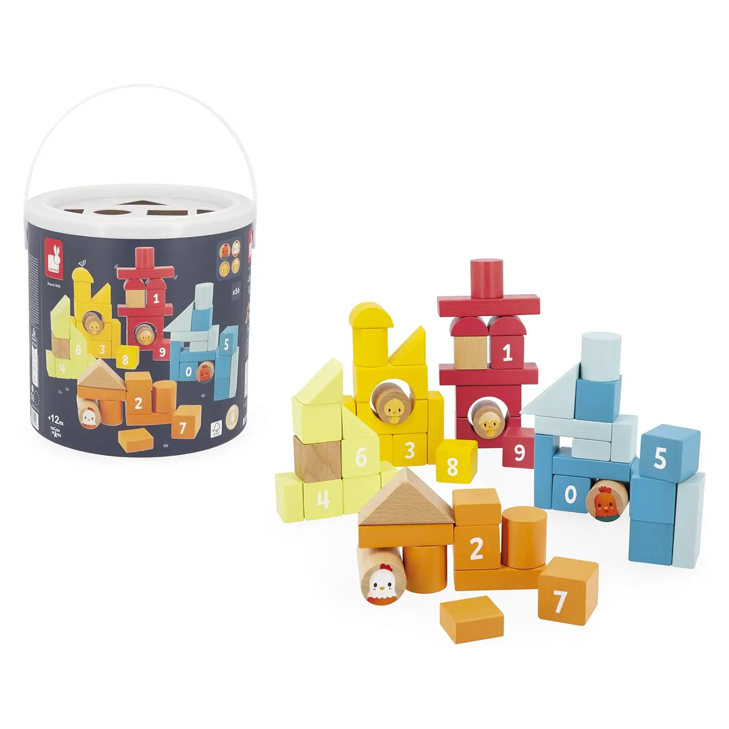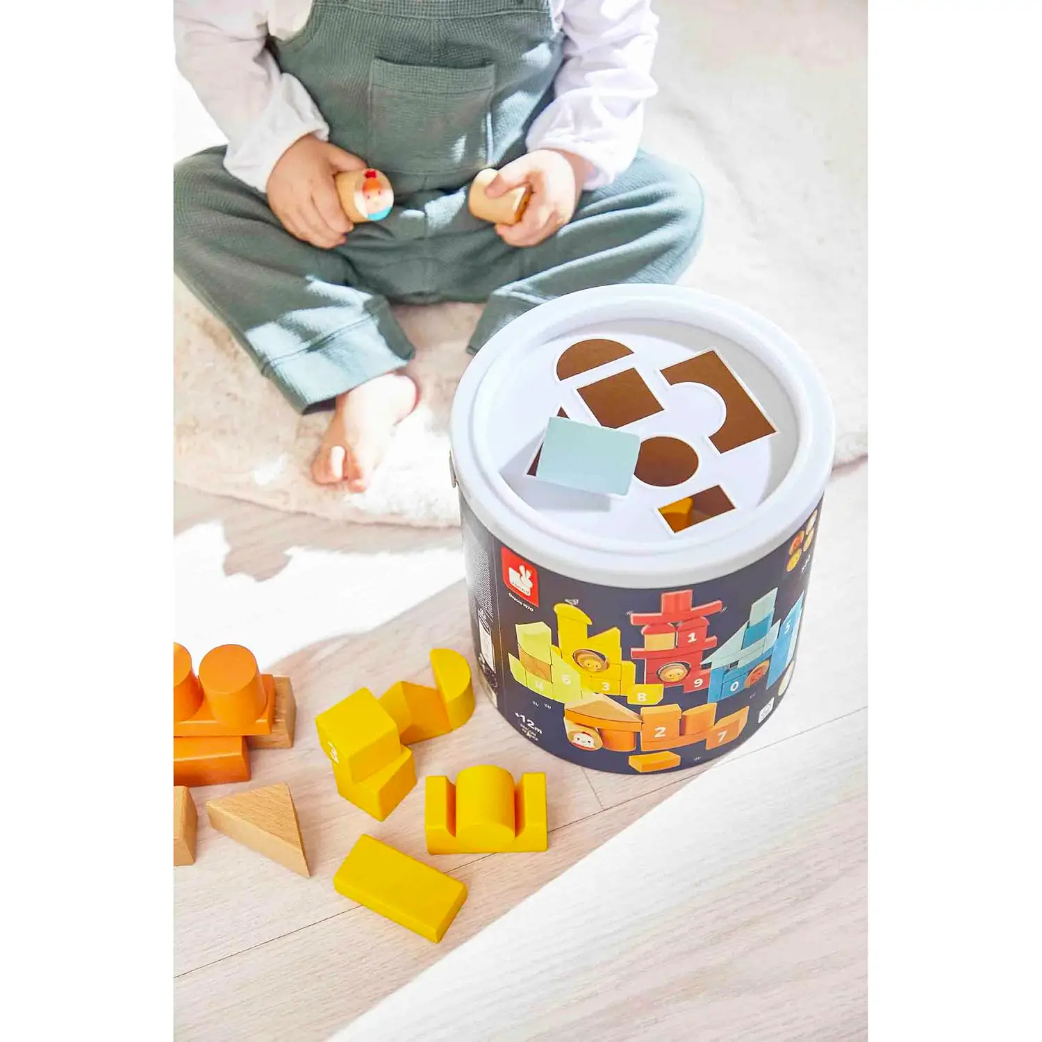 Set Costruzioni in Legno Completo Il barile Janod con 56 pezzi in legno FSC è il primo gioco di costruzione ideale dai 12 mesi. Blocchi colorati e forme diverse stimolano la creatività e invitano i bambini a costruire liberamente.