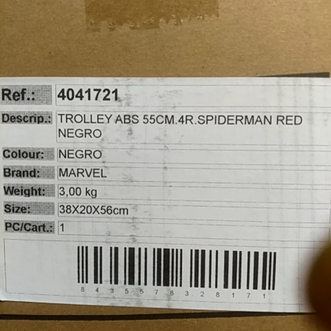 - ✅ Valigia da cabina Spiderman in ABS leggero e resistente, dimensioni 38x55x20 cm, capacità 34L, peso 2,6 kg.