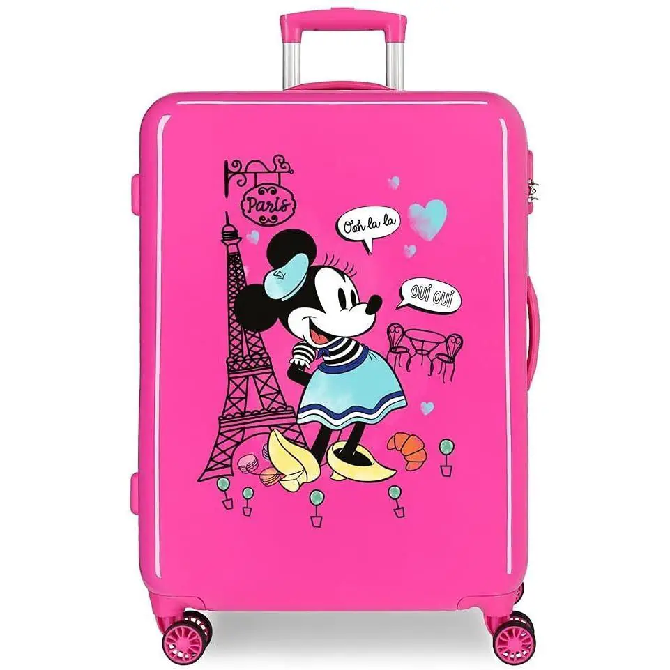 Design Minnie Paris: stile e femminilità Questa valigia da cabina unisce il fascino di Minnie con un elegante tocco parigino. Il colore fucsia brillante e la grafica “Around the World” la rendono irresistibile per giovani viaggiatrici.