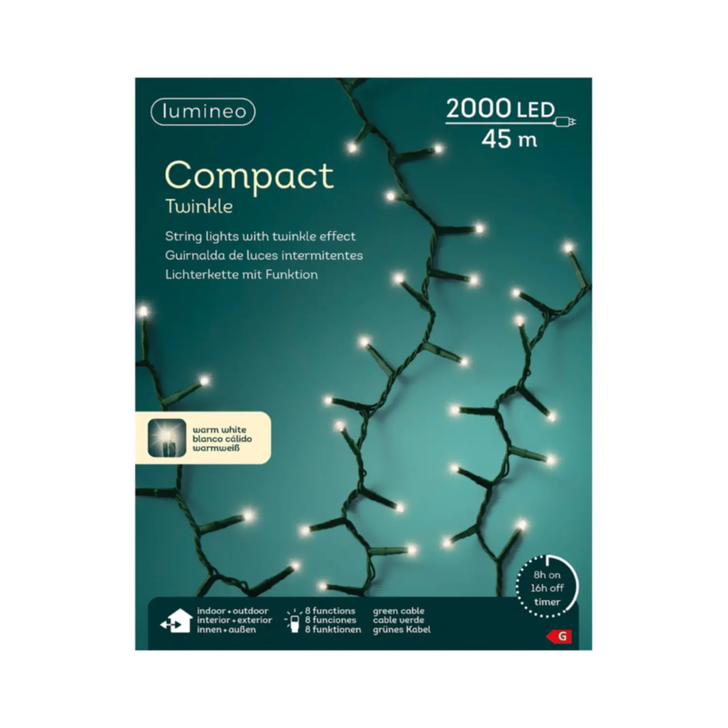Con 8 funzioni luminose, effetto luccichio e un cavo verde discreto, porterà magia e calore in ogni spazio all’aperto.