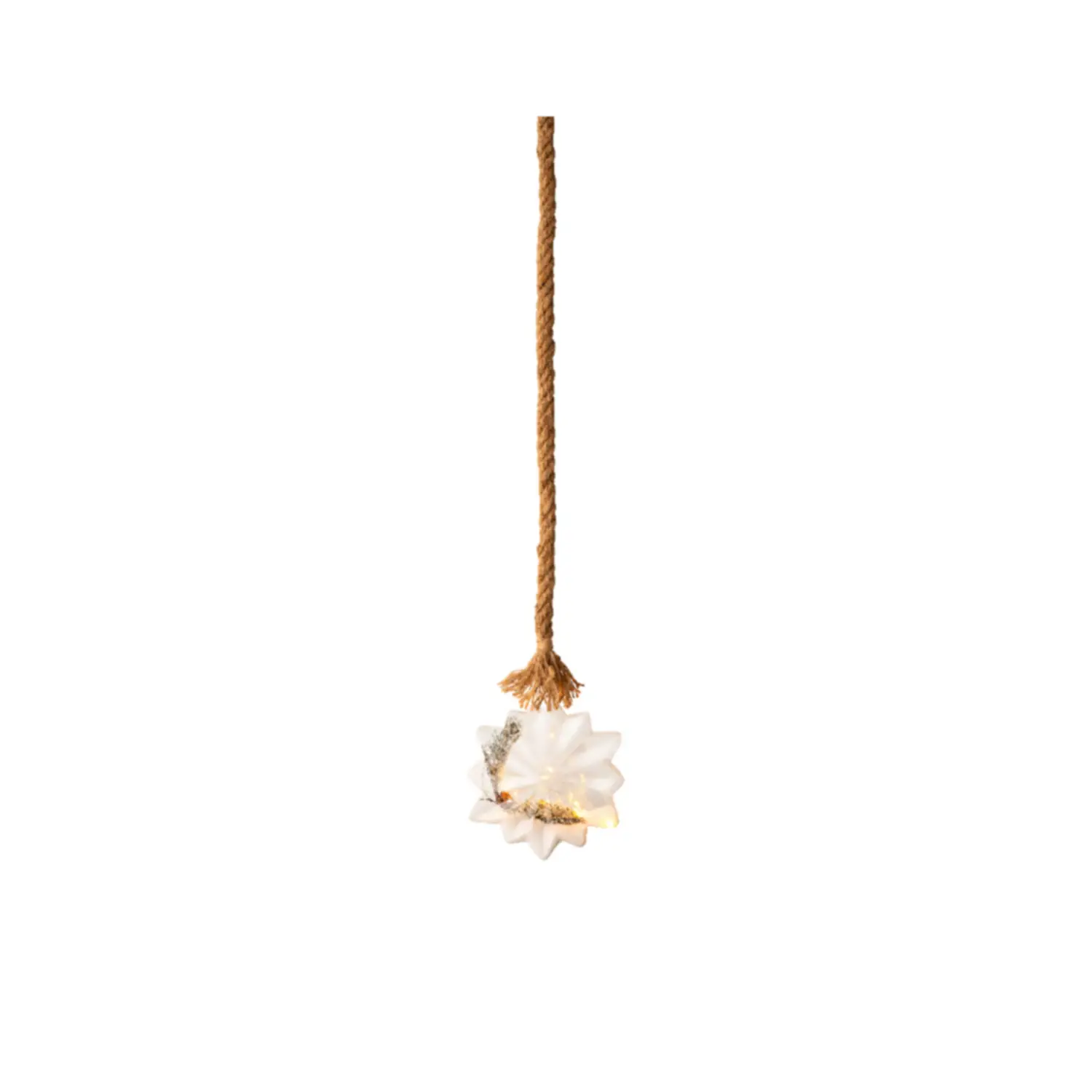 Decorazione Aggiuntiva: La stella è riempita di neve artificiale e presenta al suo interno un delicato ramoscello, aggiungendo un tocco invernale alla sua estetica.