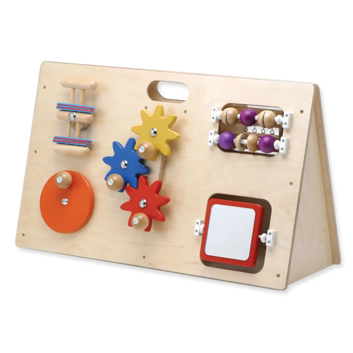 Attività di gioco presenti: 2 cilindri girevoli con sfere all’interno - palette dei colori girevoli - specchio - strumento clic-clac - ingranaggi girevoli - ruota girevole - elementi scorrevoli - specchietto girevole
